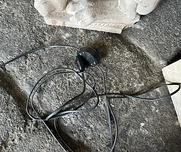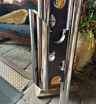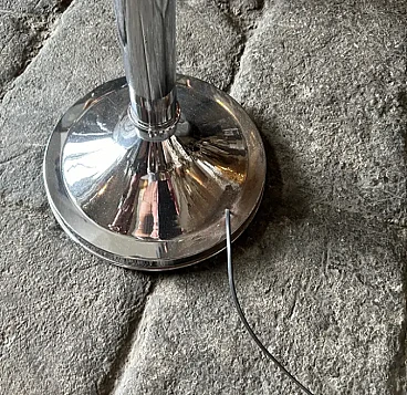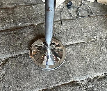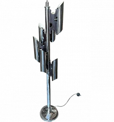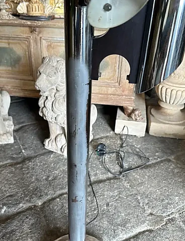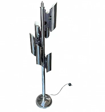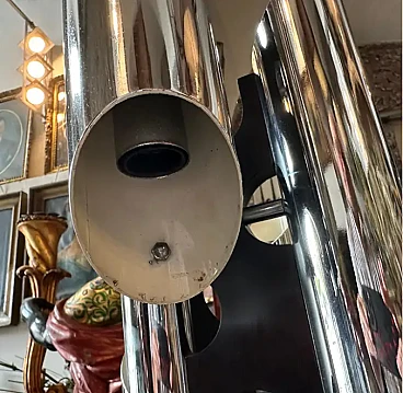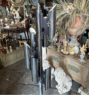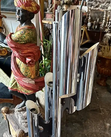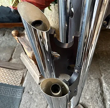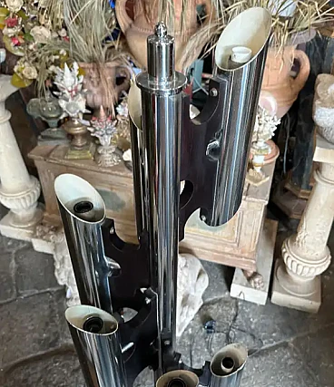 La lampada a dodici luci è una lampada da terra vintage "Space Age", che ricorda lo stile del designer italiano Gaetano Sciolari, noto per i suoi am designs futuristici e moderni della metà del secolo, ed è un pezzo di grande effetto, specialmente in un ambiente interno moderno o contemporaneo. La lampada è caratterizzata da un look elegante e futuristico associato al movimento di design A Space AGE degli anni 1960-1970. Presenta più tubi verticali cromati disposti in modo cilindrico. Ogni tubo contiene due bulbi, che gli conferiscono un aspetto a grappolo, quasi da razzo. La lampada è prevalentemente metallica, con tubi e base in ferro cromato lucido, che ne esalta l'estetica industriale e di ispirazione spaziale. Le linee pulite e la simmetria gli conferiscono un effetto minimalista ma drammatico. Stile generale: Questa lampada rientra perfettamente nello stile "A Space AGE", che enfatizza le forme futuristiche, le forme geometriche e le finiture metalliche, tutti elementi che erano molto popolari nei design dagli anni '60 agli anni '80. La lampada è stata ricablata ed è pronta a funzionare in tutto il mondo, le parti metalliche cromate presentano consistenti segni d'uso e d'età visibili nelle foto.
