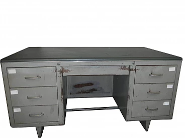 Scrivania in stile industriale anni '60, in metallo con piano in fintapelle in buono stato e cassetti funzionanti. Manca la chiave.