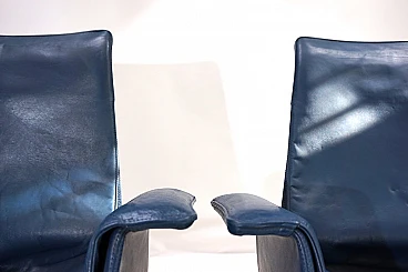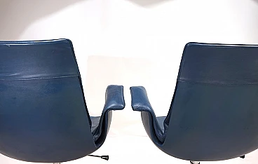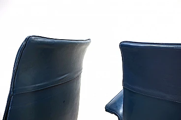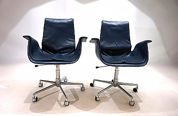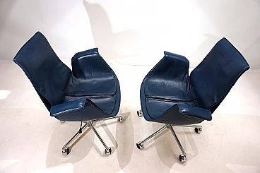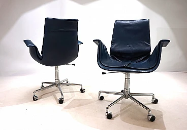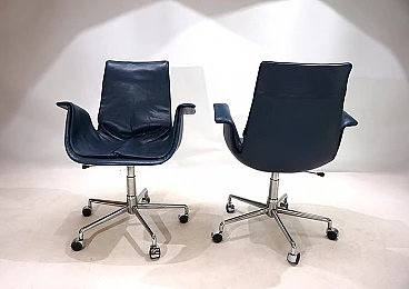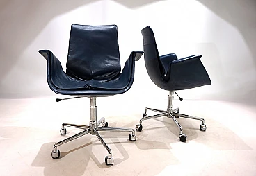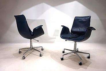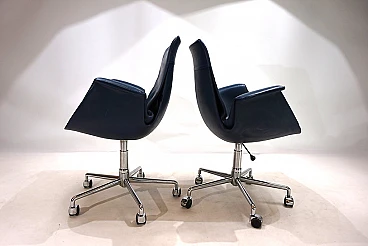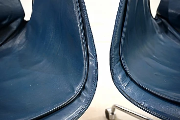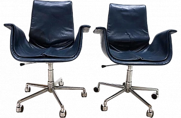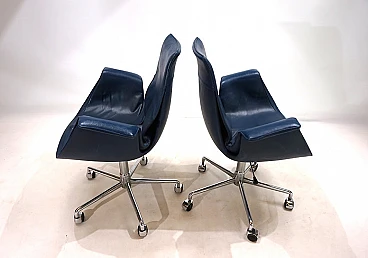 Queste sedie Kill 6727, le cosiddette sedie Bird o Tulip, sono la versione difficile da trovare di una sedia da ufficio con regolazione dell'altezza. La pelle blu delle sedie è in ottime condizioni con una bella patina e minimi segni di usura. Solo una sedia mostra un graffio sull'angolo di un bracciolo. I telai cromati con rotelle scorrevoli mostrano appena segni di invecchiamento. La regolazione idraulica dell'altezza funziona perfettamente su tutte le sedie e consente un'altezza della seduta di 43 - 51 cm. Queste sedie possono anche essere dotate di scivoli al posto delle rotelle e possono anche essere utilizzate come sedie da pranzo.