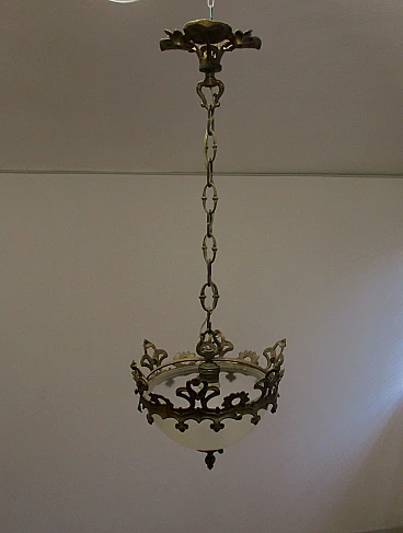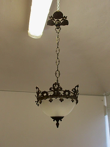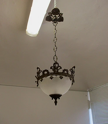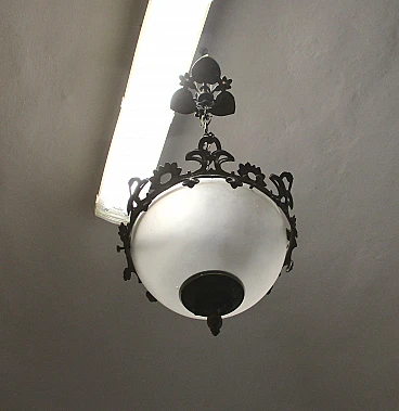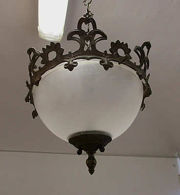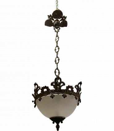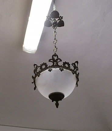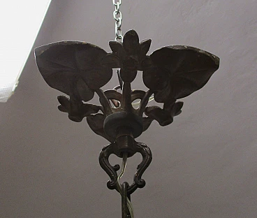 Meraviglioso antico Lampadario Liberty epoca 900 realizzato in bronzo avente paralume in vetro acidato , monta porta lampade E27 in ottone con ghiera in porcellana , molto bello e di notevole impatto scenografico grazie anche ai dettagli realizzati con accuratezza e raffinatezza ad esaltarne la bellezza e l'eleganza , ideale come oggetto d'arredo , eventuali zone più chiare sono dovute al riflesso della luce artificiale , condizioni ottime usato funzionante e come da foto. Dimensioni: altezza cm. 72 - larghezza cm. 28