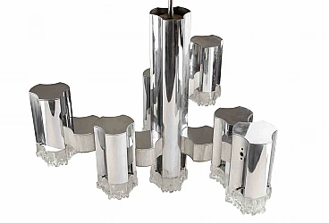 Lampadario "Modernista" attr. a Gaetano Sciolari e realizzato negli anni '70.Metallo, Vetro, Plastica.Dimensioni corpo: 54x68x68 cm.Buone condizioni.