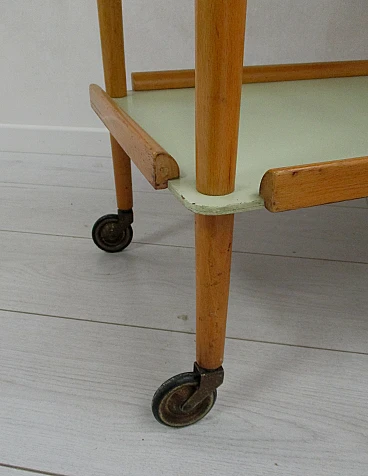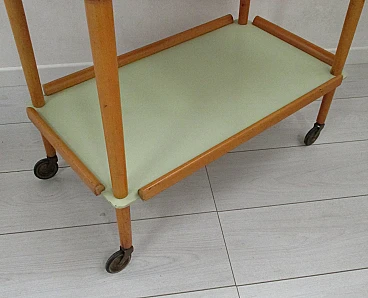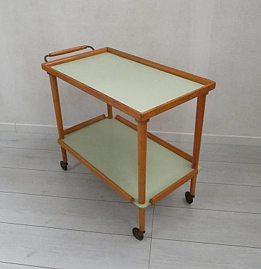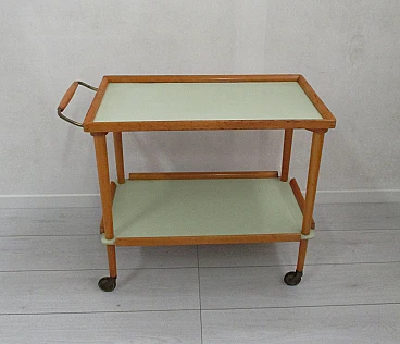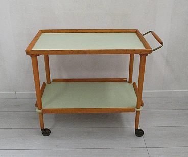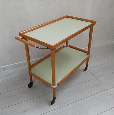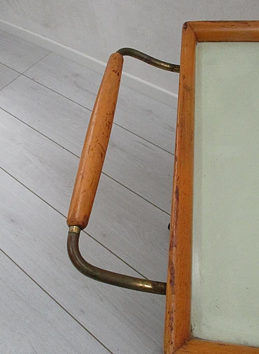 Delizioso ed elegante Carrello Tavolino bar design attribuibile Gio Ponti epoca 1940 abilmente realizzato in legno di faggio , si presenta con due ripiani a giorno con pratico maniglione in ottone avente impugnatura in legno ed impreziosito da quattro ruote in ottone , è stato restaurato e lucidato a mano con stoppino gomma lacca come veniva eseguito un tempo dai migliori restauratori dell'epoca , molto bello e di notevole impatto scenografico grazie anche ai dettagli realizzati con accuratezza e raffinatezza , ideale come oggetto d'arredo , eventuali zone più chiare sono dovute al riflesso della luce artificiale , qualche normale segno del tempo e dell'utilizzo data l'epoca del mobile , struttura sana robusta e senza tarlo , condizioni come da foto. Dimensioni: altezza cm. 64 - lunghezza cm. 79 - larghezza cm. 40