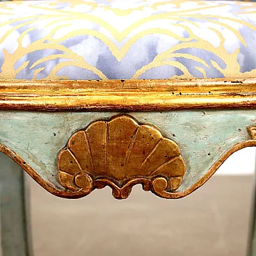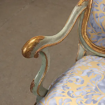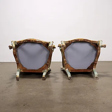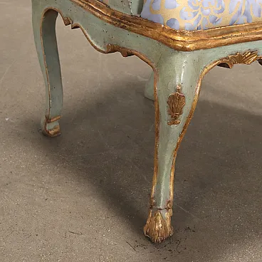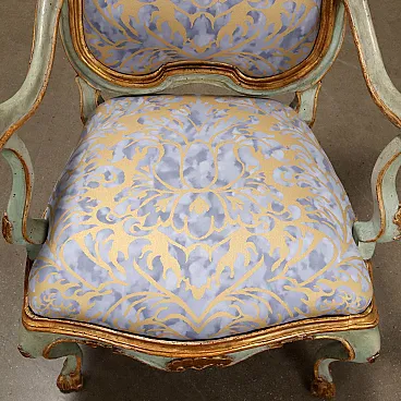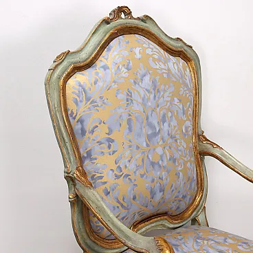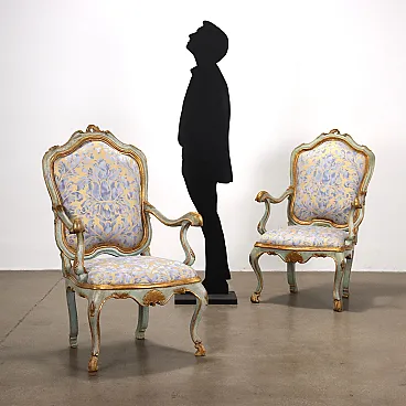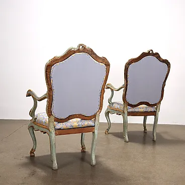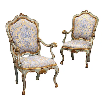 Coppia di poltrone veneziane laccate e dorate del terzo quarto del XVIII secolo. Quattro gambe mosse terminanti con ricciolo reggono una seduta con schienale a scudo mosso collegato alla fascia con due sinuosi braccioli. La seduta, realizzata in legno di noce intagliato è laccata nei toni del verde e dorata nelle parti a rilievo. Vi sono riprese nella doratura e nella laccatura originali. Sedie simili si trovano nelle grandi collezioni di arredi veneziani, segnaliamo una seduta pubblicata da Clara Santini quasi identica a quelle qui descritte ma ormai portata a noce e non più laccata.