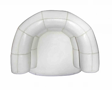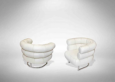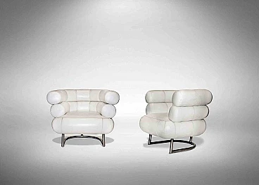 La poltrona Bibendum è un oggetto di design originale realizzato da Eileen Gray. Base in tubolare d'acciaio cromato lucido. Sedile imbottito, schienale e braccioli completamente originali degli anni '70 rivestiti in pelle bianca. Eileen Gray ha utilizzato questa sedia in alcuni dei suoi interni. Il design è stato influenzato dall'allora famoso "Bibendum" Michelin Man dei pneumatici gonfiati, che rimane il marchio di fabbrica della Michelin. Scherzava anche dicendo che questa era la sua risposta come femminista al “Grand Confort” di Le Corbusier.