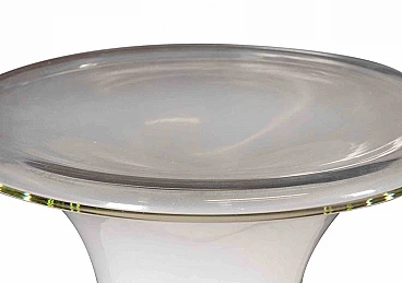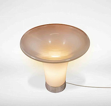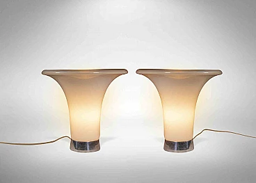 Coppia di lampade da tavolo è un oggetto di design realizzato negli anni '60 da Gino Vistosi per Vetreria Vistosi. Lampada in vetro artistico con base in metallo. Una coppia di lampade di design da collezionare! Vetreria Vistosi è un'azienda italiana attiva nel campo dell'illuminazione decorativa in vetro soffiato . La sua storia inizia nel secondo dopoguerra, quando Guglielmo Vistosi, erede di una tradizione centenaria nella lavorazione del vetro muranese, apre una nuova fornace a Murano. Negli anni '50, grazie ai nipoti Gino e Luciano Vistosi, la produzione dell'azienda cominciò a specializzarsi in articoli per l'illuminazione, suscitando notevole interesse. Nel 1960 iniziano grandi collaborazioni, fondamentali per il successo di quella che sarebbe diventata Vetreria Vistosi, che lega la sua produzione ai nomi dei più famosi designer dell'epoca, tra cui Gae Aulenti, Ettore Sottsass, Adalberto Dal Lago.