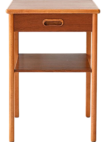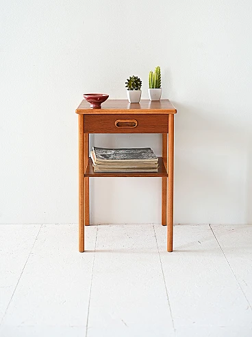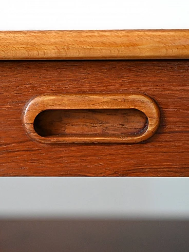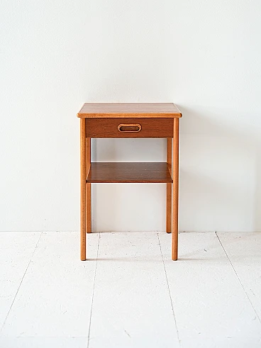 Un comodino vintage degli anni '60, caratterizzato da una forma stretta e lunga, in teak e profili in betulla.