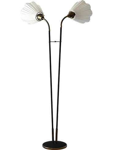 Questa lampada presenta due aste sottili nere che si elevano da una base circolare scura, fornendo stabilità e un look pulito. I paralumi plissettati bianchi, a forma di fiore, donano un tocco di eleganza e diffondono una luce morbida e accogliente. Gli steli in ottone collegano i paralumi alle aste, aggiungendo un dettaglio raffinato al design complessivo.