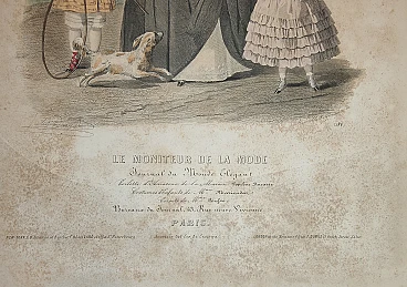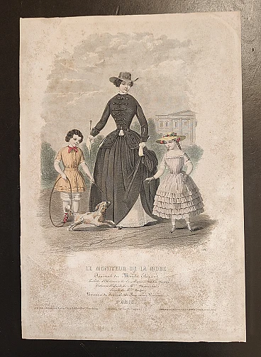 Stampa con figurini ottocentesca. Pagina di rivista di moda di Parigi. "Le moniteur de la mode. Journal du Monde Elegant", edita a Parigi dal 1843. Stampe a colori molto raffinate, create dall'artista Jules David (in firma) che illustra ambientazioni e scenografie accurate, con particolari di arredamento, sfondi e pose. Accuratissima anche la resa visiva dei diversi materiali e tagli. Per ogni modello sono elencati i fornitori di accessori e servizi (cappelli, gioielli, ventagli, guanti, veli...). Questa stampa mostra una donna in tenuta da cavallo e due bambini in tenuta da gioco, con un cagnolino. Area all'aperto, con villa classica sullo sfondo.