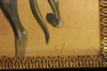 Tempera su carta di Giovanni Frattini, una reinterpretazione del famoso 'Ritratto di Luisa Casati' di Giovanni Boldini. Quest'opera d'arte cattura fedelmente le pennellate del maestro originale della Belle Époque, aggiungendo al contempo un tocco personale e distintivo. Il dipinto è splendidamente incorniciato in un'elegante cornice in legno laccato ebano con accenti in foglia d'oro patinata, dotata di vetro protettivo e di un pannello posteriore in legno massiccio. Le dimensioni dell'opera d'arte sono 100x72 cm e la cornice misura 89x117 cm, rendendola un pezzo perfetto per ogni interno raffinato.