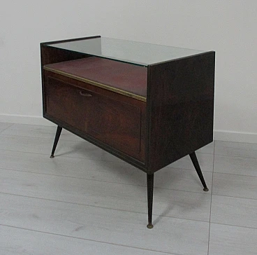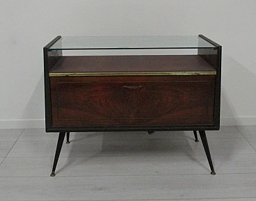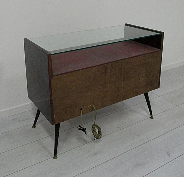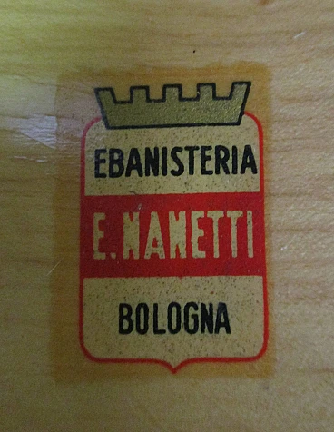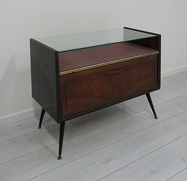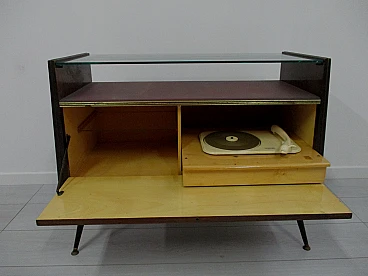 Splendido Mobile Bar design con giradischi epoca 1960 realizzato da E. Nanetti rinomato ebanista e costruttore di mobili negli anni 60 , realizzato in legno di faggio laccato con gambe a spillo aventi elementi finali a piedini in ottone , il piano superiore è in cristallo di cui è stata riscontrata qualche scheggiatura sul bordo ma nulla di serio vedi foto , l'anta frontale è a ribalta ed abbassandola rivela al suo interno due spazi di cui uno spazio a giorno con ripiano in cristallo e un'altro spazio risiede un giradischi marcato "Lesa" il quale necessita di essere testato , molto bello e di notevole impatto scenografico grazie anche ai dettagli realizzati con accuratezza e raffinatezza , ideale come oggetto d'arredo , eventuali zone più chiare sono dovute al riflesso della luce artificiale , condizioni come da foto. Dimensioni: altezza cm. 63 - larghezza cm. 81 - profondità cm. 39