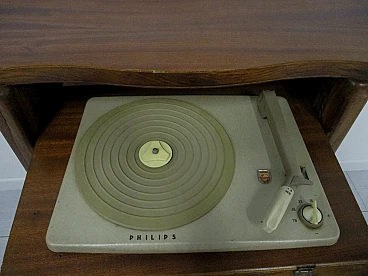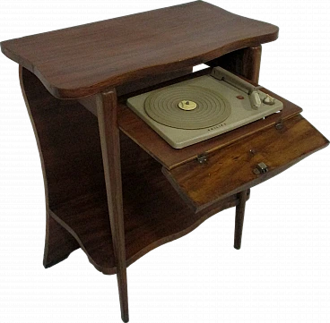 Splendido Tavolino con giradischi Philips epoca 1950 , realizzato in rovere con parti impiallacciate ed avente pomolo in ottone , impreziosito da splendido giradischi integrato a scomparsa della Philips il quale necessita di essere testato il suo funzionamento , il mobile è stato restaurato con lucidatura finale a mano con stoppino gomma lacca come veniva eseguito dai maestri restauratori dell'epoca , molto bello e di notevole impatto scenografico grazie anche ai dettagli realizzati con accuratezza e raffinatezza , ideale come oggetto d'arredo , eventuali zone più chiare sono dovute al riflesso della luce artificiale , condizioni come da foto. Dimensioni: altezza cm. 80 - larghezza cm. 69 - profondità cm. 37