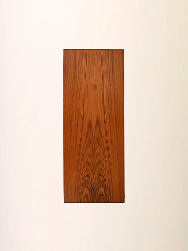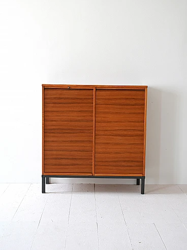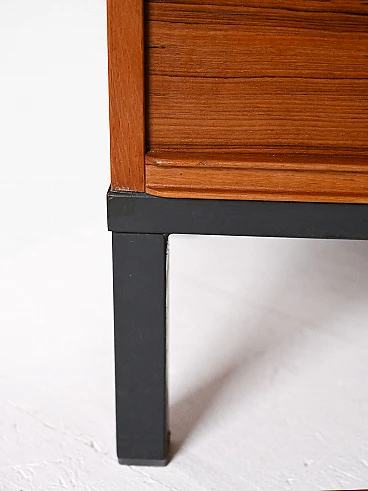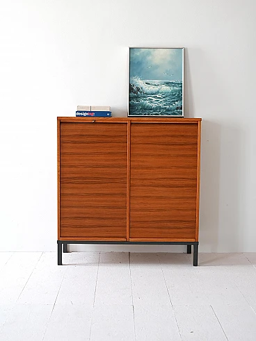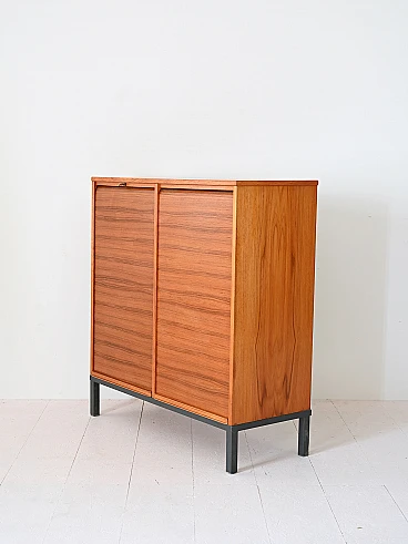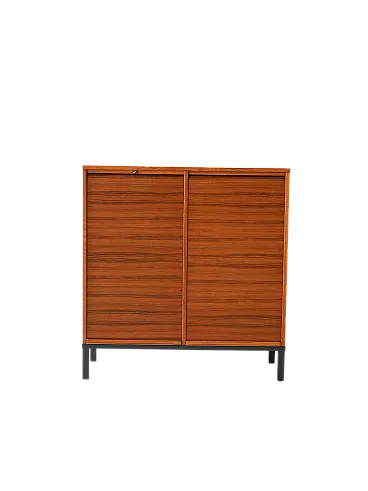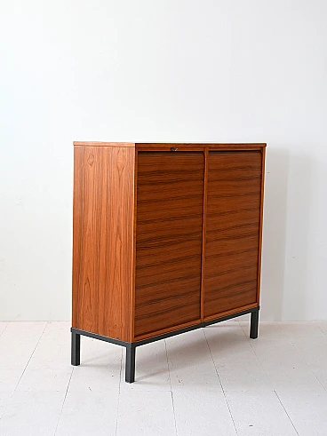Archivio svedese anni '70 realizzato in legno di teak, caratterizzato da serrande scorrevoli. La struttura solida poggia su una base in metallo verniciato nero. L'interno è organizzato con cassetti tipici da ufficio, perfetti per l'archiviazione di documenti o piccoli oggetti. Le serrande scorrono agevolmente, permettendo di mantenere il contenuto nascosto o a vista secondo necessità.