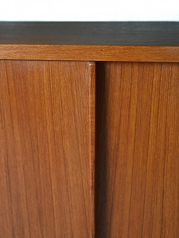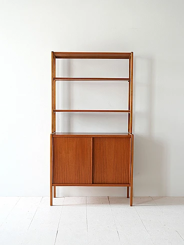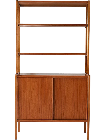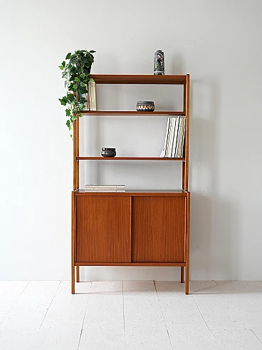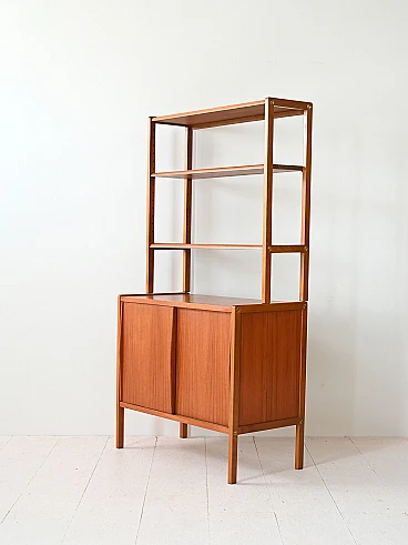 Mobile vintage anni '60 in teak, composto da scaffali aperti e un vano inferiore con ante scorrevoli.