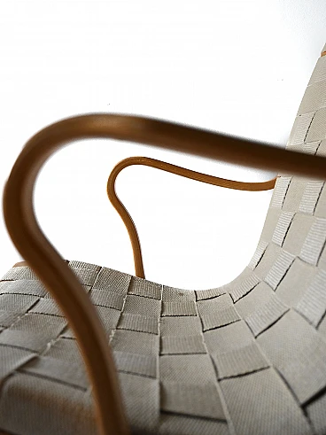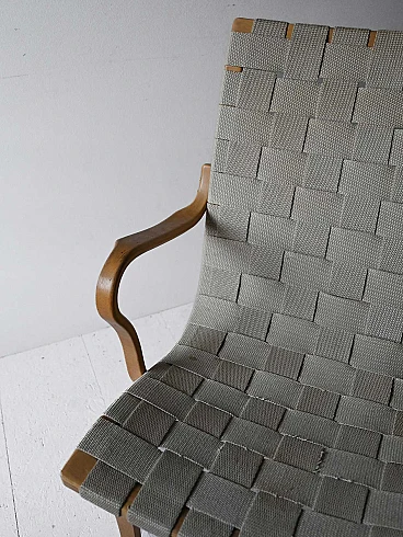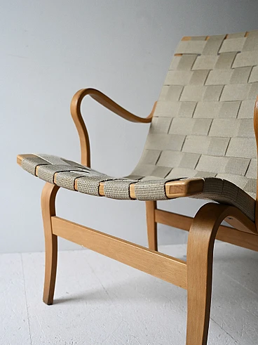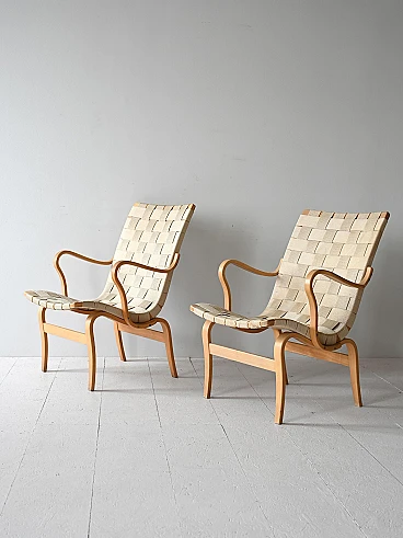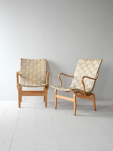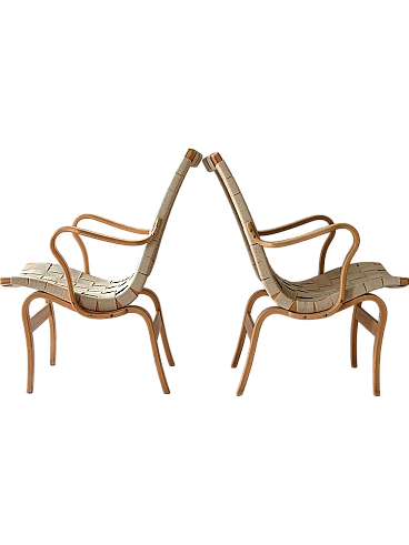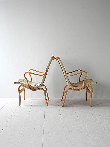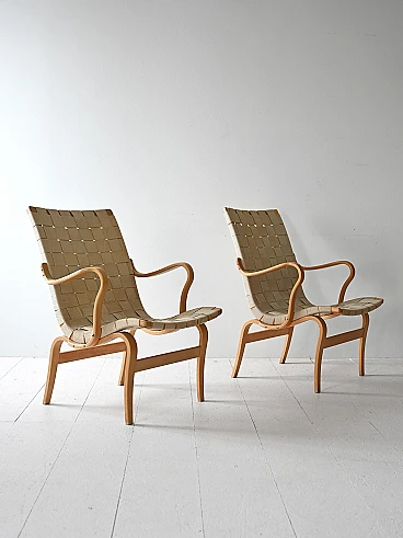 Coppia di poltrone modello "Eva" disegnate da Bruno Mathsson, con struttura in legno curvato e seduta in tessuto intrecciato. Iconico design scandinavo degli anni '40.