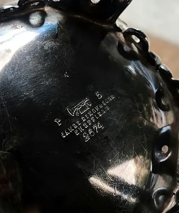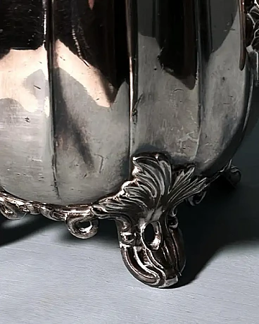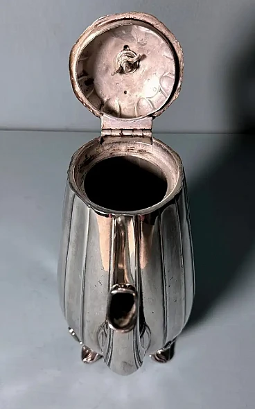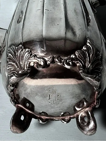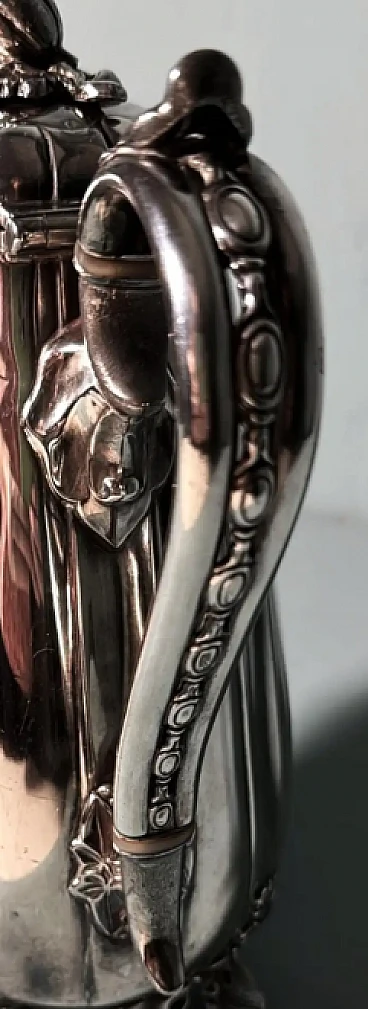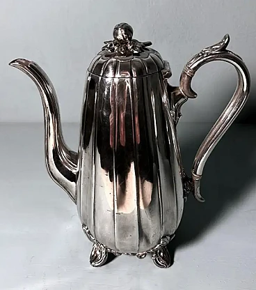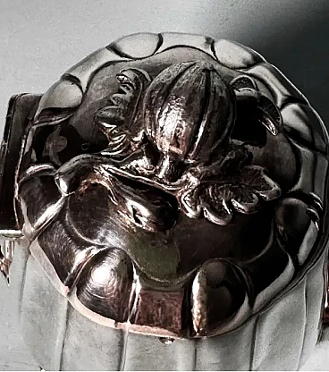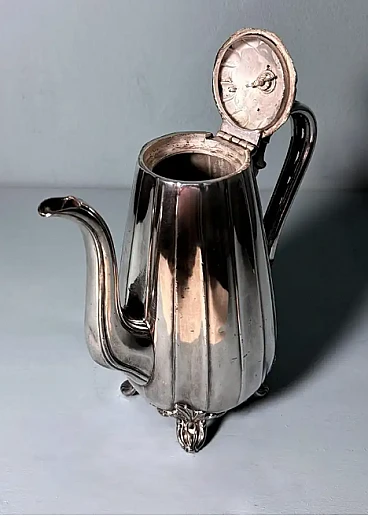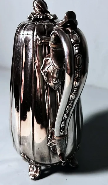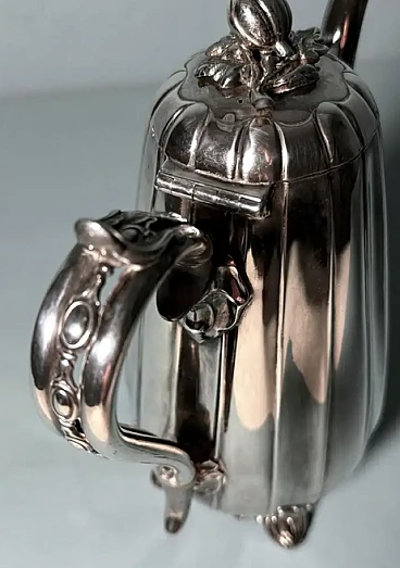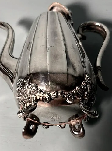 Una sobria e lineare teiera-cioccolatiera inglese placcata in argento; la forma allungata e morbidamente curvata di ricca eleganza è sostenuta da quattro piedini fusi; anche il beccuccio e il manico hanno un design molto raffinato; sul coperchio è fissata una cyma fusa che rappresenta un piccolo frutto con foglie. Sul fondo la teiera reca il timbro della James Dixon Company di Sheffield, con la classica trombetta con stendardo e il nome completo; da questi elementi si evince che l'oggetto è stato realizzato tra il 1890 e il 1895 nella fabbrica di Dixon a Sheffield. James Dixon & Sons è stata fondata a Sheffield, in Inghilterra, nel 1806 ed è stata una delle principali aziende manifatturiere britanniche della Rivoluzione Industriale, contribuendo a dare alla città la sua reputazione globale di eccellenza manifatturiera. Inizialmente lavorava con peltro, metallo galvanico, Britannia Metal e alpacca, ma nel corso degli anni l'azienda ha affinato le sue capacità ed è diventata sinonimo di posate e oggetti in argento sterling e placcati in argento. Clienti consolidati in tutto il mondo, dai consolati alle famiglie reali, sono sempre stati la clientela dell'azienda; la loro richiesta di massima qualità è sempre stata il punto di riferimento per i laboratori. L'azienda espose alla Grande Esposizione del 1851, ricevendo numerosi premi in diverse classi per l'argento e il metallo Britannia. Il libro dei costi di Dixon del 1879 include disegni di Christopher Dresser, registrati a partire dal 1880, che sono stati prodotti almeno fino al 1895, secondo il catalogo commerciale pubblicato quell'anno. Il primo marchio aziendale della tromba e dello stendardo fu concesso nel 1879, mentre il secondo con il nome fu aggiunto nel 1890. Alcuni autori sostengono che il marchio della tromba e dello stendardo sia stato registrato ufficialmente nel 1881, anche se era già in uso prima di allora. Negli anni '20 l'azienda iniziò a utilizzare l'acciaio inossidabile per la produzione di oggetti piatti e cavi, mentre la produzione di oggetti in argento e placcati in argento diminuì. I cucchiai e le forchette in acciaio inossidabile prodotti da James Dixon & Sons portavano i nomi "staybrite" e "Firth", in quanto Firth Brown era l'azienda in cui l'acciaio "staybrite" era stato inventato negli anni '10 del secolo scorso. Nel 1920 l'azienda fu trasformata in una società a responsabilità limitata e nel 1930 William Hutton & Sons Ltd di Sheffield fu assorbita da William Dixon & Sons Ltd. Negli anni '80 l'azienda ebbe un tracollo finanziario e la produzione di Cornish Place chiuse nel 1992. La teiera è in buone condizioni. Misura larghezza cm.26, profondità cm.12, altezza cm.25.