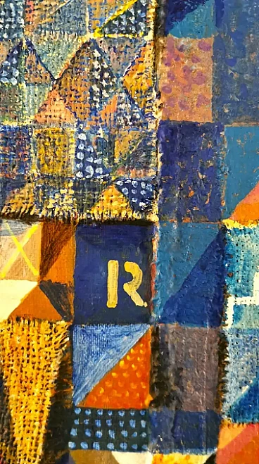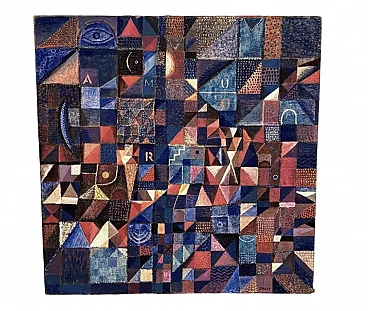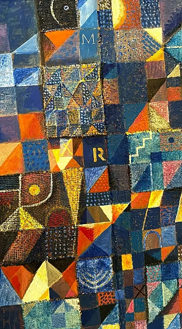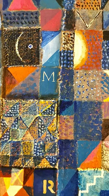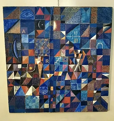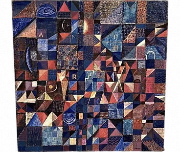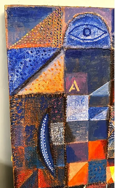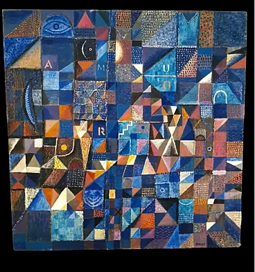 Questo pezzo è un dipinto a olio su tela, realizzato con una tecnica mista di pennello e spatola. Inizialmente l'artista ha utilizzato pennelli tradizionali, poi è passato con decisione alla tecnica della spatola, applicando i colori in modo denso e costante, conferendo al dipinto una consistenza e una profondità particolari. Con la sua composizione geometrica, i colori vivaci e l'approccio astratto, quest'opera può essere attribuita al movimento dell'astrazione geometrica. Nell'astrazione geometrica, nota anche come "Arte concreta", l'enfasi è posta sulle forme geometriche, che rappresentano un ritorno alle linee geometriche fondamentali e all'uso dei colori primari: giallo, blu e rosso. Questo movimento artistico si è sviluppato principalmente nel XX secolo, ispirandosi al cubismo e alle opere di artisti come Paul Klee e Wassily Kandinsky. La pittura sembra esplorare forme geometriche semplici in combinazione con colori che creano un forte contrasto visivo. Il gioco di forme, simboli e colori suggerisce anche un'influenza dell'arte simbolista, che mira a trascendere la realtà visibile per esprimere concetti più profondi. Per quanto riguarda la sua epoca, possiamo stimare con certezza che questo dipinto risale alla seconda metà del XX secolo, un periodo in cui l'astrattismo e il geometrismo furono ampiamente sperimentati dagli artisti, in particolare nell'Europa orientale e occidentale. La tecnica mista di olio e tempera su tela è caratteristica di questo periodo, quando gli artisti si divertivano a combinare i materiali per creare effetti visivi più complessi.Sul retro del dipinto c'è un'iscrizione in bulgaro. Il testo "Пътят към звездите" si traduce in "Il sentiero delle stelle", il che potrebbe suggerire un significato più profondo o simbolico, forse legato all'aspirazione, alla scoperta o alla trascendenza. Sul retro è inciso anche il nome "СТЕЛИ", che molto probabilmente è il nome dell'artista. "Стели" (Steli) è un nome slavo, forse un diminutivo o una variazione del nome completo dell'artista. Dato l'uso del cirillico e della lingua bulgara nel titolo del dipinto, è ragionevole supporre che l'artista sia di origine bulgara. La traduzione in francese sul retro, "Stelly", avvalora ulteriormente questa ipotesi. Tuttavia, non siamo in grado di fornire informazioni definitive sull'identità dell'artista. La pittura astratta in Bulgaria si è sviluppata in modo significativo nella seconda metà del XX secolo, seguendo l'influenza generale dei movimenti modernisti e astratti che si sono diffusi in Europa dopo la Seconda Guerra Mondiale. Mentre i paesi dell'Europa occidentale videro la nascita del movimento astrattista già negli anni '10 e '20, in Bulgaria la sua diffusione avvenne più tardi, soprattutto a causa delle condizioni politiche imposte dal regime comunista, che favoriva l'arte realista e ideologicamente allineata. Negli anni '60, la Bulgaria iniziò a mostrare una maggiore apertura nei confronti dell'arte moderna e fu in questo periodo che il movimento astrattista iniziò a svilupparsi in modo più completo. Ciò è dovuto in parte alla maggiore esposizione degli artisti bulgari alle tendenze artistiche internazionali e alle opportunità di partecipare a mostre internazionali, anche se le restrizioni imposte dal regime hanno reso difficile la piena espressione dell'arte d'avanguardia. Di questo dipinto possiamo affermare la straordinaria estetica e l'accattivante vivacità. È un'opera che, con la sua gioiosa freschezza e il suo forte appeal decorativo, si presta a valorizzare qualsiasi ambiente della casa. Il dipinto è stato intenzionalmente realizzato senza cornice; la tela è fissata a un solido supporto di legno, il cui retro è interamente ricoperto di carta. Il dipinto è in ottime condizioni. Dimensioni: Larghezza 70 cm, altezza 70 cm, profondità 3 cm.
