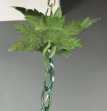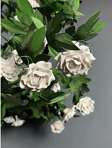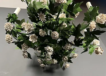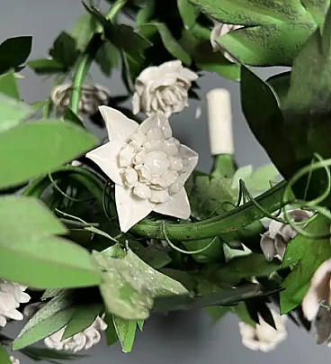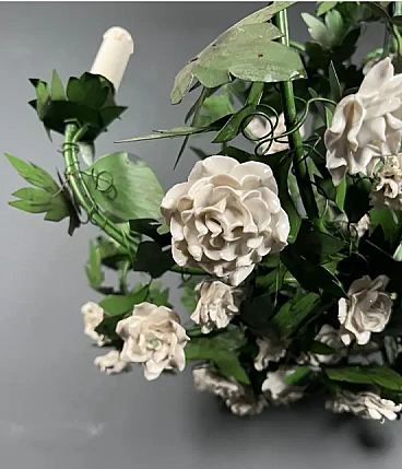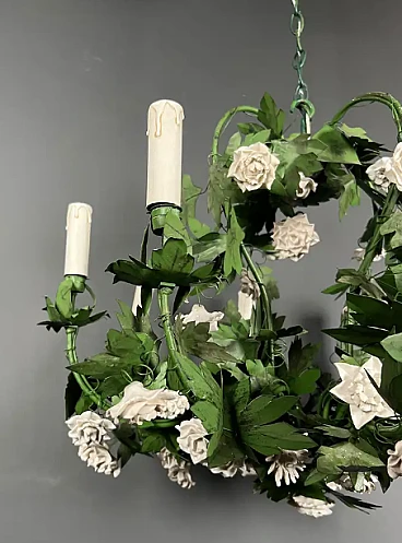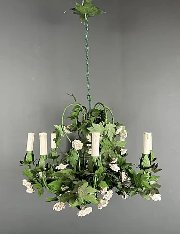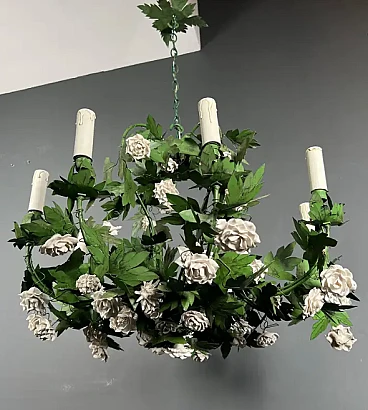 Lampadario in lamiera dipinta e fiori in porcellana, anni '70