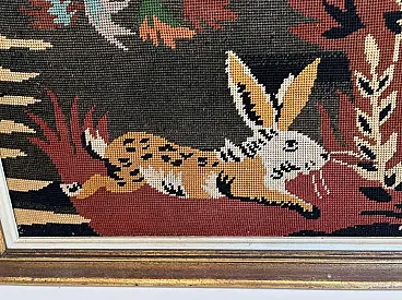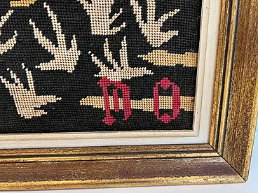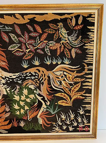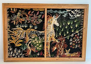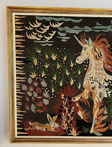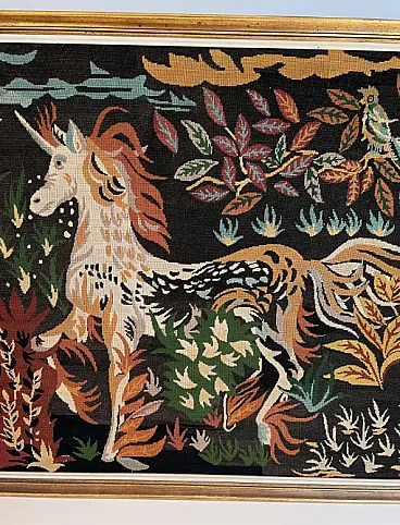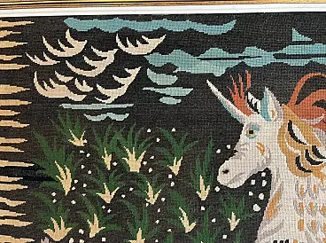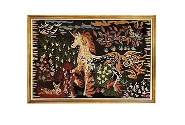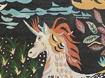 Grande arazzo raffigurante un unicorno firmato MO, anni '50