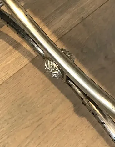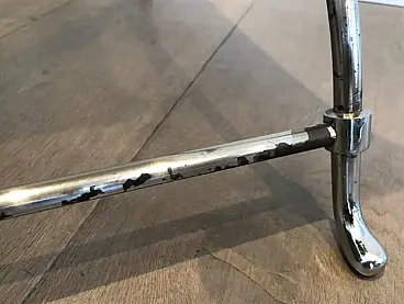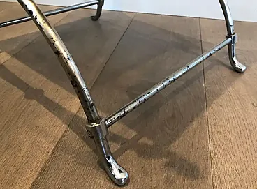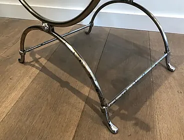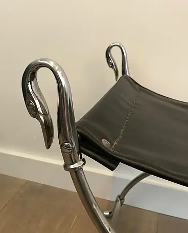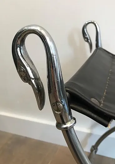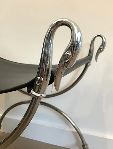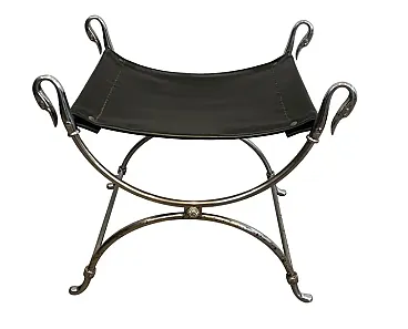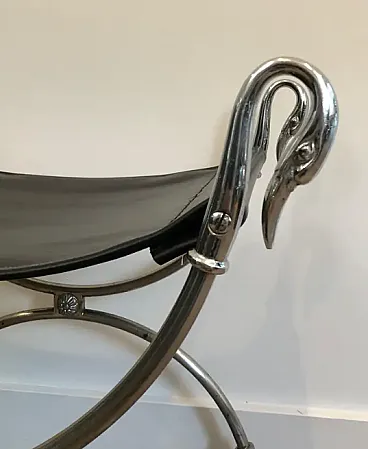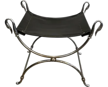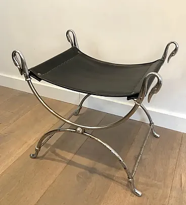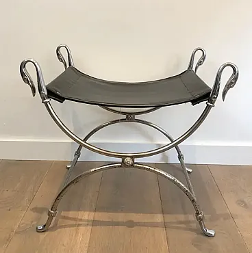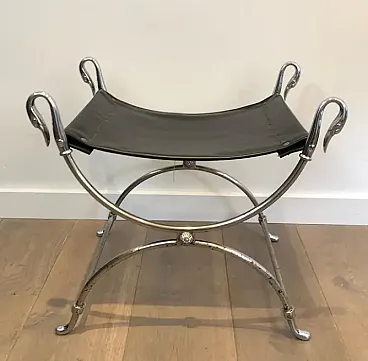 Sgabello Curule in acciaio argentato ed ecopelle, anni '40