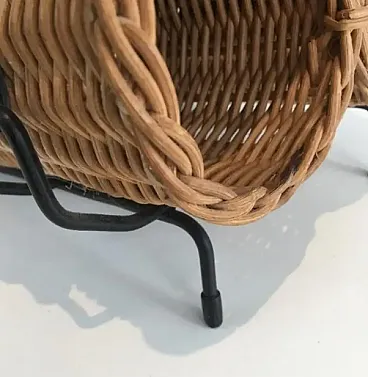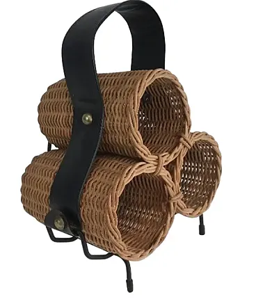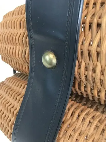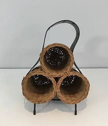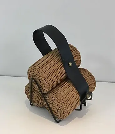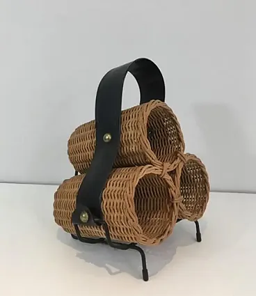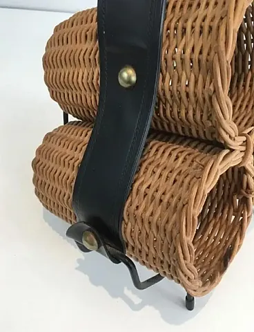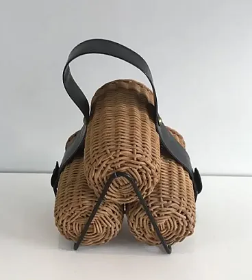 Portabottiglie in rattan, metallo laccato nero ed ecopelle, anni '70