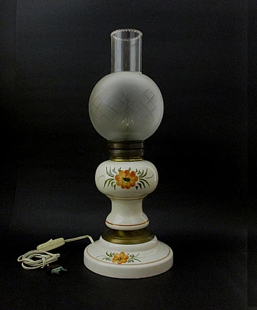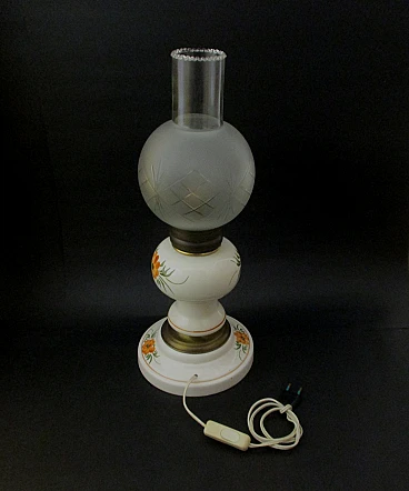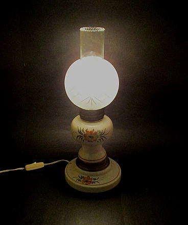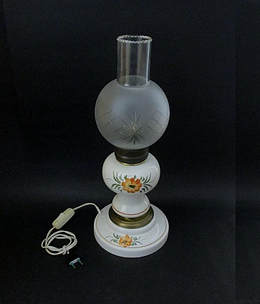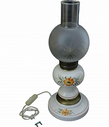 Meravigliosa elegante antica Lampada a lume attribuibile a ceramica bassano dell'epoca metà 900 , realizzata in ceramica con elemento in ottone ed impreziosita da splendidi decoro floreali dipinti , avente paralume in vetro acidato con bellissimi decoro molati , monta porta lampada E27 , è munita di interruttore per accendere e spegnere la luce , molto bella e di notevole impatto scenografico grazie anche ai dettagli realizzati con accuratezza e raffinatezza , ideale come oggetto d'arredo , eventuali zone più chiare sono dovute al riflesso della luce artificiale , condizioni ottime come da foto. Dimensioni con paralume: altezza cm. 50 - larghezza cm. 20