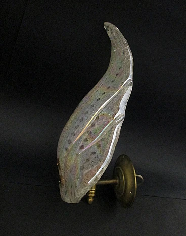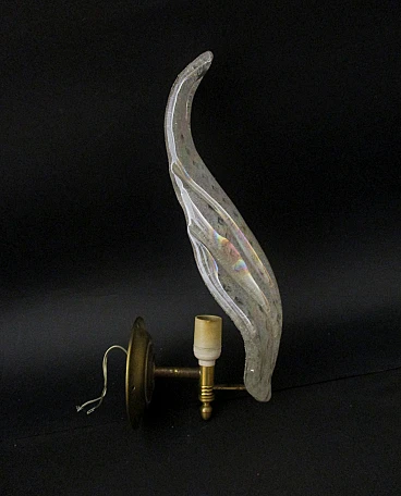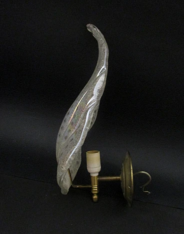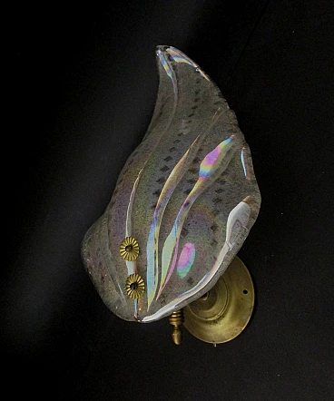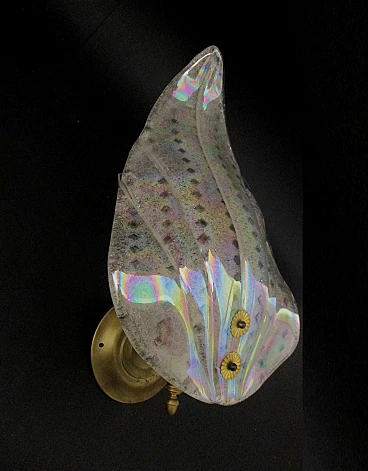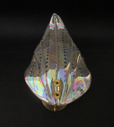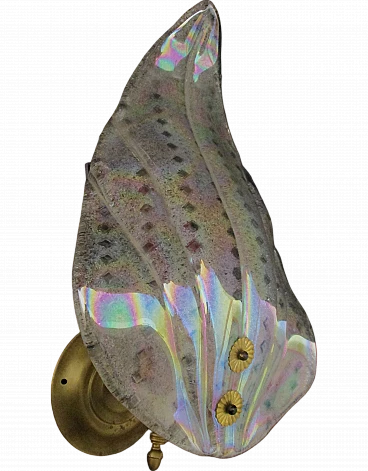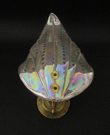 Meravigliosa ed elegante antica grande Applique murano Barovier & Toso epoca 1950 richiamante la forma della foglia , realizzata in vetro di murano soffiato a mano ed avente elementi in ottone impreziositi da ricchi dettagli , monta porta lampade E14 con ghiera in porcellana , questa splendida applique rappresenta il fascino di quel periodo caratterizzato da dettagli sofisticati ed eleganti , molto bella e di notevole impatto scenografico grazie anche ai dettagli realizzati con accuratezza e raffinatezza dai maestri muranesi dell'epoca , manifattura italiana , ideale come oggetto d'arredo per impreziosire qualsiasi ambiente o semplicemente per aggiungervi un tono di eleganza e bellezza , eventuali zone più chiare sono dovute al riflesso della luce artificiale , condizioni ottime usata perfettamente funzionante e come da foto. Dimensioni: altezza cm. 29 - larghezza cm. 20 - profondità cm. 12