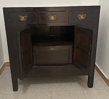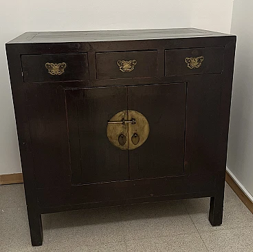 Credenza in stile orientale finitura laccata e supporti in ottone, con tre cassetti alti e ante centrali con ripiano e ulteriore vano chiuso. Dimensioni H103XL102X62 cm