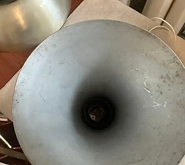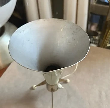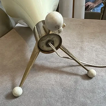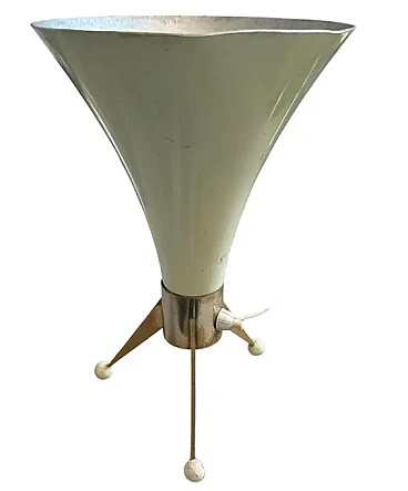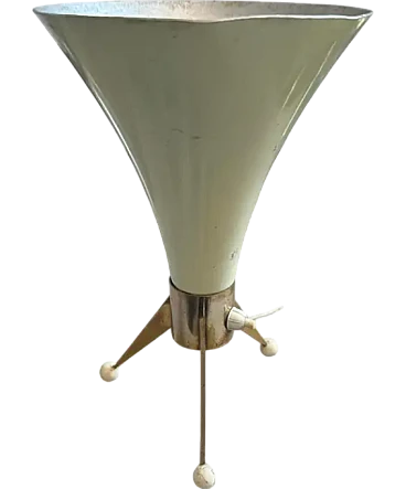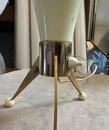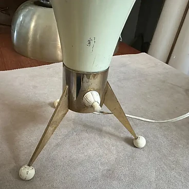 Una lampada da tavolo Sputnik progettata e prodotta in Italia negli anni Cinquanta. La lampada è funzionante, l'ottone ha la patina originale, il cono di alluminio verde chiaro ha segni di utilizzo e di età visibili nelle foto. Questa lampada rappresenta un'epoca iconica nella storia del design e continua a essere un simbolo di raffinatezza e innovazione nel mondo dell'arredamento. La sua forma aggraziata e spaziale e la calda finitura in ottone ne fanno un pezzo forte in grado di elevare l'estetica di qualsiasi stanza. È costruito principalmente con ottone di alta qualità e alluminio verniciato di verde. La finitura in ottone non solo aggiunge un tocco di opulenza, ma conferisce anche una luce calda e invitante alla stanza quando viene illuminata. Si integra perfettamente in un'ampia gamma di stili d'interni, dal moderno di metà secolo al contemporaneo, rendendolo un pezzo d'arredamento ambito dagli appassionati di vintage e moderno. Questa lampada rappresenta un'epoca iconica nella storia del design e continua a essere un simbolo di raffinatezza e innovazione nel mondo dell'arredamento. La sua forma aggraziata e spaziale e la calda finitura in ottone ne fanno un pezzo forte in grado di elevare l'estetica di qualsiasi stanza.