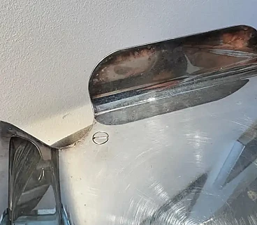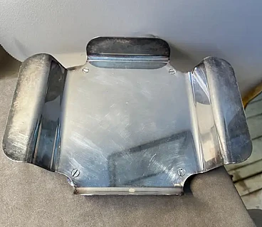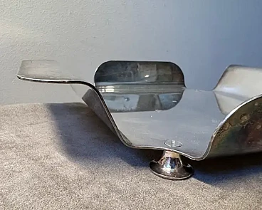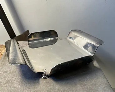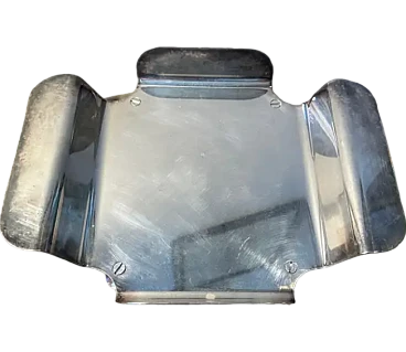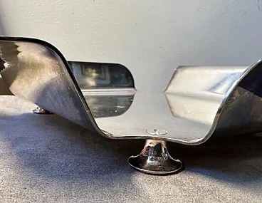 Questo portatovaglioli da tavola argentato presenta un design elegante e geometrico con una finitura metallica lucida, tipica dell'estetica minimalista dell'epoca. Il supporto ha una forma piegata, con due lembi laterali che si estendono verso l'esterno per accogliere i tovaglioli. Le sue linee pulite e la sua superficie riflettente suggeriscono una tecnica di argentatura di alta qualità, rendendolo un pezzo distintivo di stoviglie moderniste degli anni '80, ispirate ai principi del design italiano che privilegia forma e funzionalità.