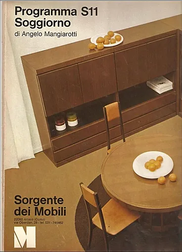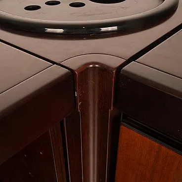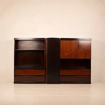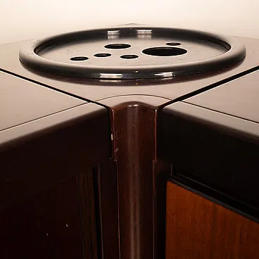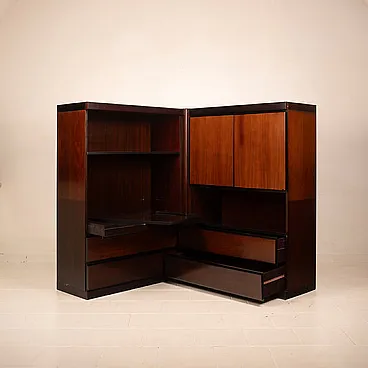Coppia di armadietti con angolo a colonna bar, appartenenti alla serie S11 di Angelo Mangiarotti per La Sorgente dei Mobili di fine anni '60. Il set è modulare e collocabile sia ad angolo che a muro, interamente realizzato in palissandro africano con elementi in massello. Un armadietto presenta due cassetti e un vano superiore con due ante mentre il secondo armadietto, molto più particolare, presenta due cassetti e un ripiano estraibile, con base ruotante, che permette l'incasso di un televisore con la possibilità di direzionarlo a piacimento. Completa il set una colonna, sempre rivestita interamente in palissandro, la quale ha sulla sommità un vano in plastica nera circolare dove riporre il ghiaccio e le bottiglie in fresco. Il set si presenta in ottime condizioni, senza particolari difetti o danni.