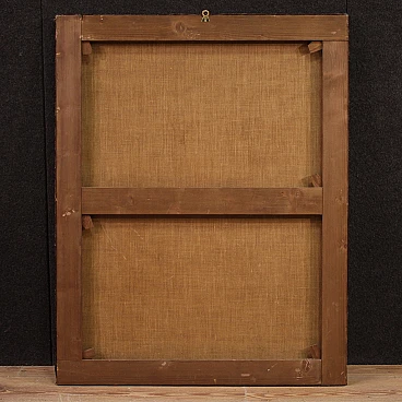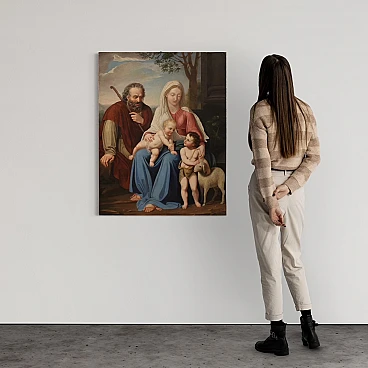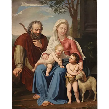 Raffinato dipinto della prima metà del XIX secolo. Opera ad olio su tela raffigurante Sacra Famiglia con San Giovannino, di notevole qualità pittorica. Quadro attribuibile al gruppo dei Nazareni, pittori romantici tedeschi attivi a Roma dal 1810. Si ribellarono al classicismo accademico aspirando ad un arte rinnovata che prende a modello lo stile dei pittori quattrocenteschi italiani. Ritroviamo infatti nella composizione un severo equilibrio formale e l'utilizzo del colore crudo steso con pennellate uniformi. La Vergine spicca per la vivacità cromatica delle vesti che mette in risalto la purezza lattea degli incarnati. San Giuseppe osserva in disparte mentre Gesù bambino si protende dolcemente verso San Giovannino accompagnato da un meraviglioso agnello. Quadro già restaurato con rintelo, sostituzione del telaio e ripresa del colore in piccoli punti. Nel complesso in ottimo stato conservativo.