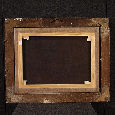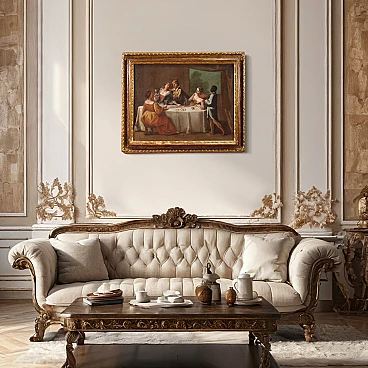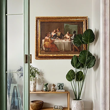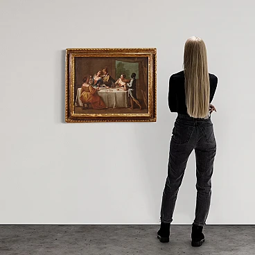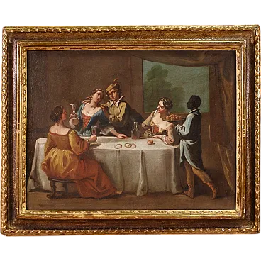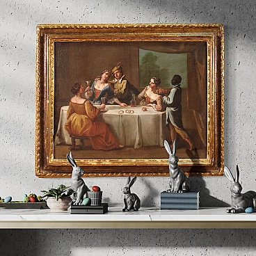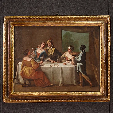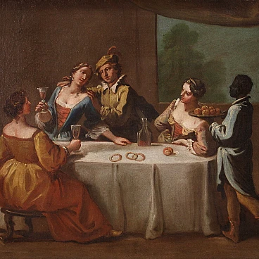 Scuola veneziana della metà del XVIII secolo. Dipinto ad olio su tela raffigurante rara scena d'interno con elegante banchetto, di notevole qualità pittorica. Opera attribuibile alla bottega del pittore italiano Gaspare Diziani (1689-1767), mancante di autentica. Quadro di grande raffinatezza e ricco di preziosi dettagli evidenti in particolare nella realizzazione delle vesti. L'uomo e la donna sulla sinistra sembrano già una coppia nella fase di corteggiamento mentre sulla destra entra in scena un servo moresco che porta un vassoio di libagioni. Cornice del XIX secolo in legno intagliato, laccato e dorato, con alcuni difetti e segni del tempo (vedi foto). Opera già restaurata con rintelo, sostituzione del telaio e ripresa del colore in piccoli punti. Nel complesso in ottimo stato conservativo. Luce dipinto H 53,5 x L 70,5 cm.