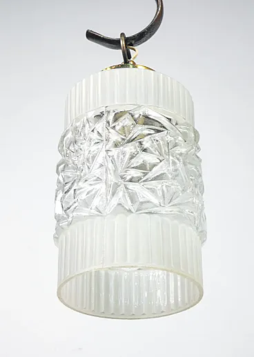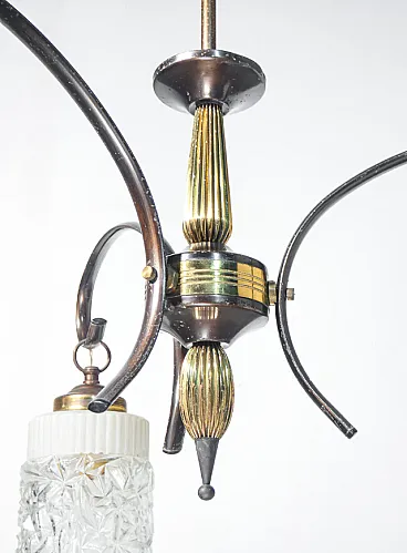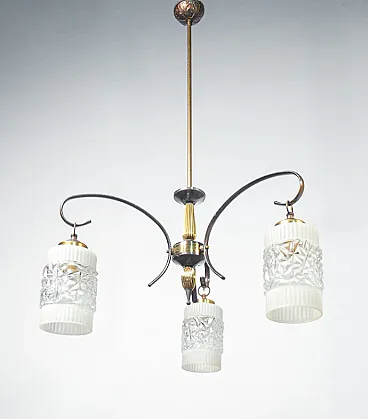 Lampadario a tre bracci in ottone e vetro, anni '40
