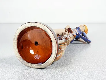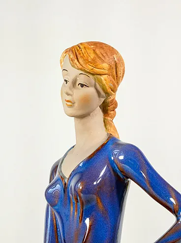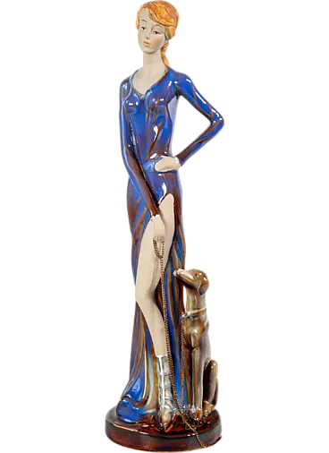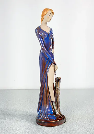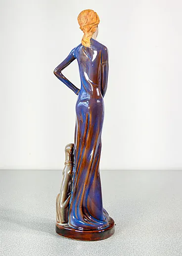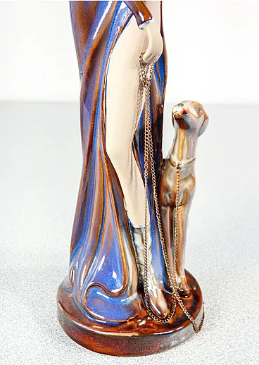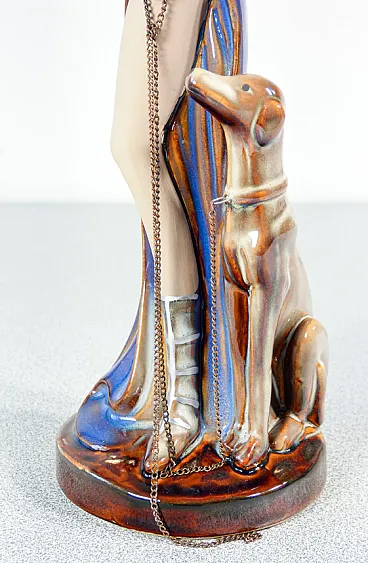 Donna con cane al guinzaglio in ceramica smaltata, metà '900