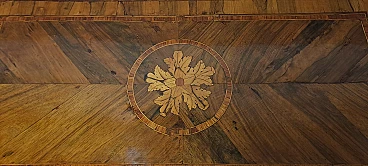 L' intera superficie è finemente riquadrata con filetti e cornici in bois de rose ed ulivo e centralmente è collocato un rosone a foglie d' acanto realizzato in legno di bosso.