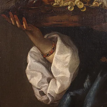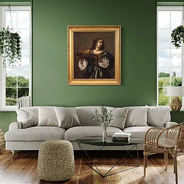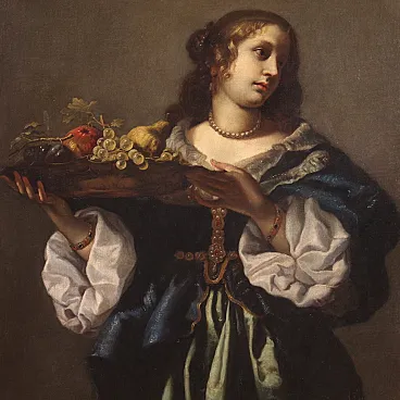Grande ritratto di dama della seconda metà del XVII secolo. Opera ad olio su tela di notevole qualità pittorica raffigurante giovane fanciulla con piatto di frutta attribuibile al pittore italiano Onorio Marinari (1627-1715), mancante di autentica. Cugino e allievo di Carlo Dolci, raccolse l'eredità del maestro e portò avanti la sua scuola. Da sottolineare la straordinaria qualità esecutiva della natura morta e del panneggio, con dettagli naturalistici ed effetti chiaroscurali di grande raffinatezza. Cornice del XX secolo in legno intagliato e dorato, di bella decorazione, con alcuni segni del tempo. Opera già restaurata con rintelo, sostituzione del telaio e ripresa del colore in piccoli punti. Nel complesso in ottimo stato conservativo. Luce dipinto H 94 x L 82 cm.