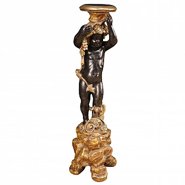 Servo muto italiano della metà del XX secolo. Mobile in legno scolpito, laccato, argentato e dipinto con grande scultura raffigurante putto su basamento laccato. Putto che presenta due piccole cadute di colore che mostrano una tinta argentata nella parte sottostante (vedi foto), probabile colore originale del putto. Oggetto di bella decorazione con piano superiore di misura contenuta, piano utile 18 cm (vedi foto). Scultura per antiquari e arredatori che presenta alcune piccole cadute di colore, nel complesso in buono stato conservativo.