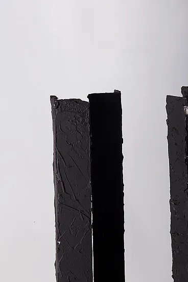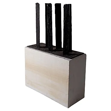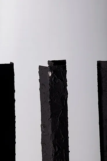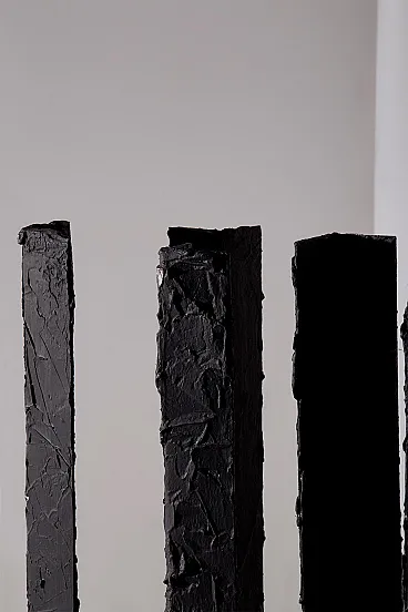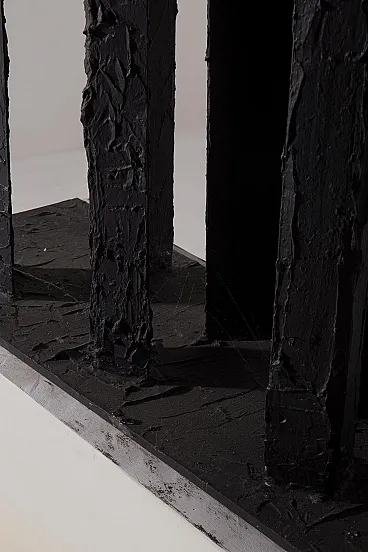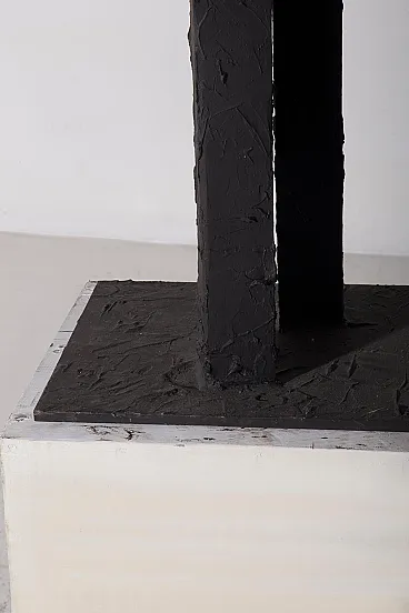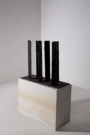 Questa scultura degli anni Ottanta è una potente testimonianza dell'arte moderna astratta contemporanea, un'opera che incarna l'essenza del design industriale trasformato in poesia visiva. Realizzata dal talentuoso artista mantovano Brunelli Mario, l'opera si distingue per la sua struttura solida e imponente, composta da colonne di ferro dipinte di nero che si ergono con una forza primordiale, quasi a evocare l'immagine di un'antica foresta pietrificata. Le superfici ruvide e volutamente imperfette di queste colonne raccontano una storia di materia e di tempo, dove ogni pennellata di vernice nera sembra amplificare l'intensità delle forme, rendendole contemporaneamente opache e misteriose. Queste forme salgono dalla base in legno, un robusto piedistallo che contrasta con la ferocia del ferro, quasi a voler radicare la forza dell'opera nel regno terreno. Il nero profondo che domina la scultura non è solo un colore, ma un elemento emotivo che assorbe lo sguardo e invita lo spettatore a perdersi nei dettagli delle superfici, a immaginare le storie che potrebbero nascondersi dietro ogni piega e crepa. Questa scultura è un esempio perfetto di come l'arte astratta possa comunicare senza parole, utilizzando forme semplici ma potenti per evocare emozioni complesse. L'origine italiana dell'opera non è solo un dettaglio geografico, ma un cenno a una tradizione artistica che per secoli ha esplorato la bellezza attraverso la materia e la forma, con Brunelli Mario che si inserisce in questa tradizione con una voce unica e contemporanea.