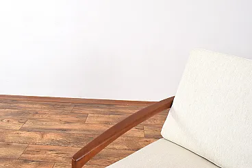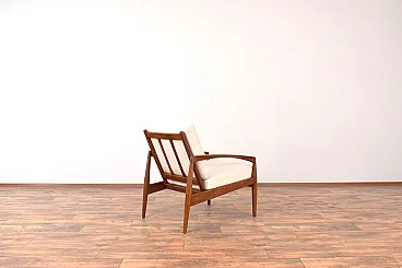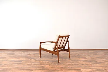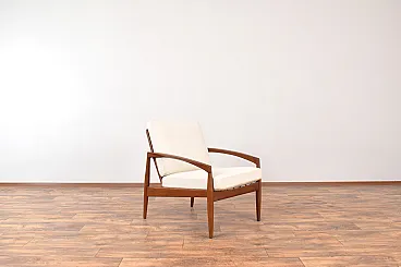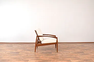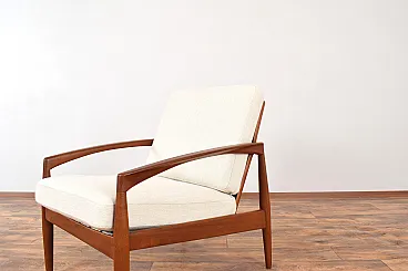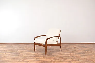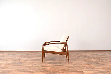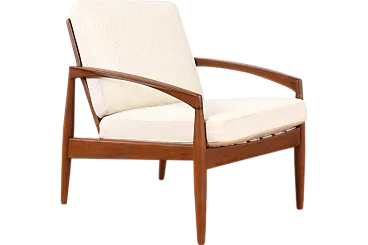 La poltrona modello 121, conosciuta come "Paper Knife Chair", è stata progettata negli anni '60 da Kai Kristiansen e prodotta in Danimarca da Magnus Olesen. La struttura è in teak ed è stata sottoposta ad un restauro professionale e meticoloso da parte di un falegname con esperienza ventennale, consistente nella rimozione di vecchi rivestimenti, colorazione e rifinitura con vernice. I cuscini sono stati rivestiti in un tessuto beige composto da un misto di lino, cotone e viscosa, che ricorda nella trama i materiali originariamente utilizzati negli anni '60.