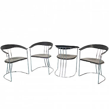 Set 4 sedie, struttura in acciaio cromato con seduta e schienale in metallo curvato e rivestito in pelle color nero, anni '70. Buone condizioni generali, potrebbe presentare normali segni di usura dovuti al tempo.