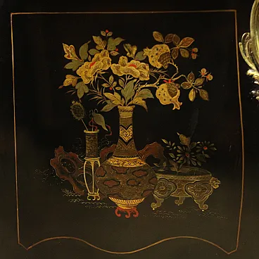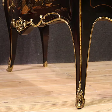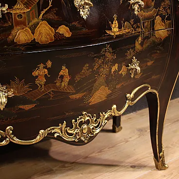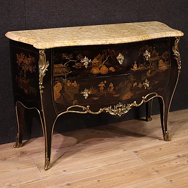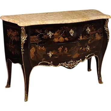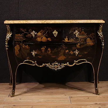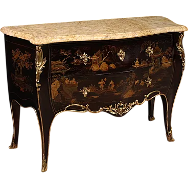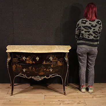 Bellissimo comò francese della seconda metà del XX secolo. Mobile in stile Luigi XV, laccato a cineseria, riccamente adornato da bronzo e metallo dorato e cesellato. Comò a due cassetti di buona capacità, munito di marmo originale di ottima misura e buon servizio. Cassettone da camera o salotto, per antiquari e arredatori, di grande qualità, perfetta proporzione e difficile reperibilità. Decoro frontale con personaggi, architetture e animali di grande piacevolezza, fianchi adornati da vasi con fiori (vedi foto). Mobile completo di una chiave funzionante, in ottime condizioni.