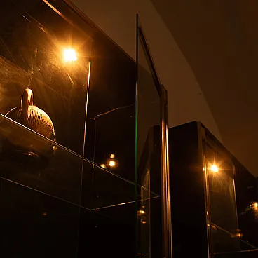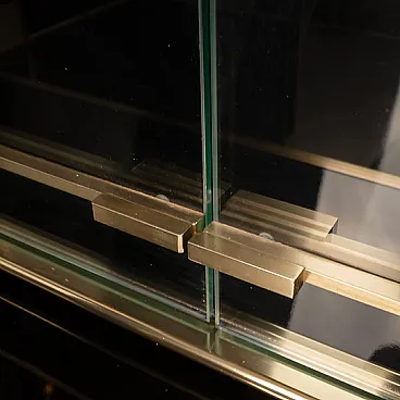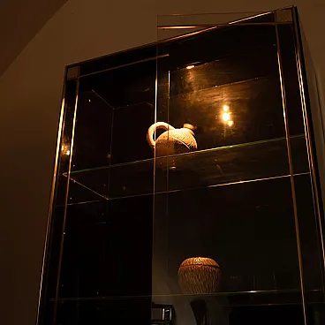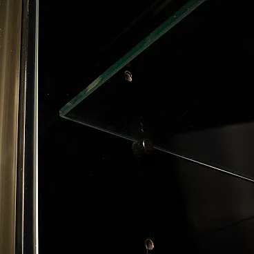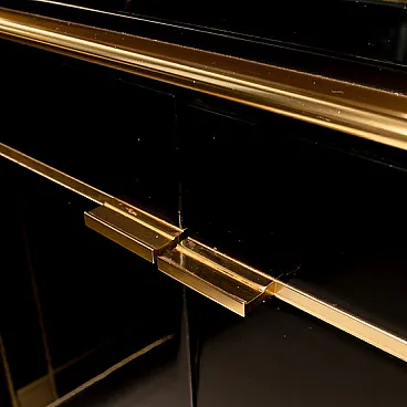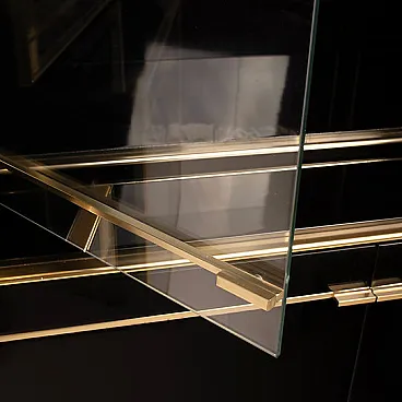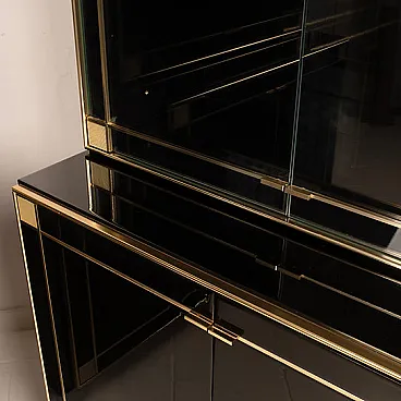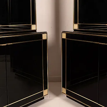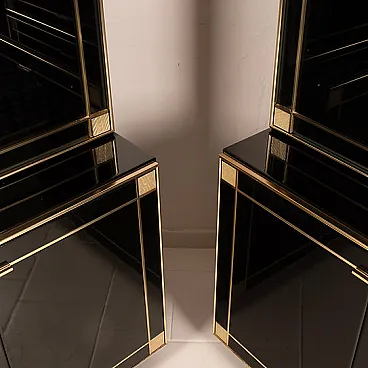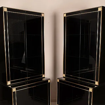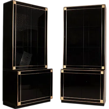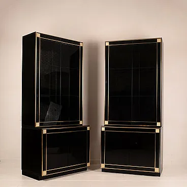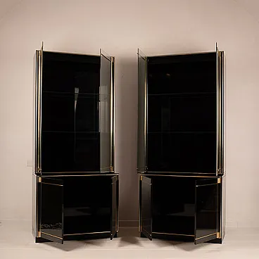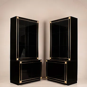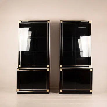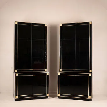 Coppia di vetrine disegnate da Pierre Cardin e prodotte da Roche Bobois negli anni '70. Le vetrine si presentano in ottime condizioni e sono realizzate in legno laccato nero lucido, ottone, cristallo e dettagli in sintetico simil madre perla negli angoli. Presentano un vano ad ante in legno inferiore richiuso, con mensola e un vano superiore con due mensole in cristallo chiuse da due ante sempre in cristallo. Completano lo straordinario set le luci all'interno delle parti superiori, le quali attraverso un meccanismo si accendono solo quando si apre l'anta in cristallo, illuminandone il contenuto.