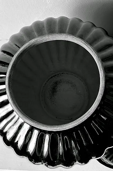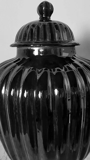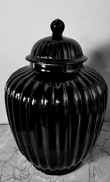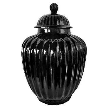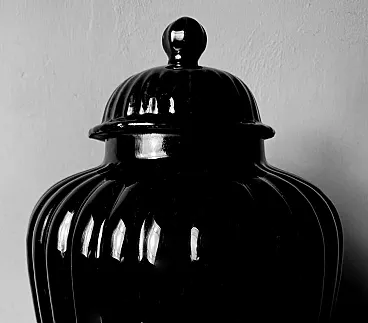 Questa elegante e rara potiche cinese presenta un classico design orientale. In assenza di dettagli specifici come firme o timbri, dobbiamo analizzare le sue caratteristiche di fabbricazione. Il vaso presenta una superficie nera lucida e riflettente, ottenuta grazie a uno smalto vetrificato di alta qualità, una tecnica spesso utilizzata nella produzione di ceramiche cinesi pregiate. Le nervature verticali che decorano la superficie suggeriscono uno stile artigianale che può essere ricondotto al tardo periodo Qing, tra il 1910 e il 1912, quando la Rivoluzione Xinhai pose fine ai duemila anni di storia imperiale della Cina e segnò l'inizio della Cina moderna. Tuttavia, nel regno della porcellana, non c'è stata una rottura immediata con la tradizione. Gli artigiani cinesi continuarono a produrre opere ammirate sia a livello nazionale che internazionale. Le fabbriche di produzione hanno mantenuto l'uso di tecniche antiche, radicate in millenni di tradizione. In questa potiche, il colore nero dominante, insolito nelle ceramiche comuni, indica una produzione meno tipica rispetto alla classica porcellana bianca e blu. L'uso dello smalto nero indica un oggetto di prestigio probabilmente destinato a speciali occasioni cerimoniali. Per quanto riguarda il luogo di produzione, Jingdezhen spicca come probabile origine, essendo stata considerata per secoli la capitale della ceramica cinese, in particolare per le porcellane personalizzate e dal design unico. Il design della potiche è particolarmente caratteristico: il coperchio, con la sua caratteristica di pomello, e il corpo scanalato conferiscono un senso di simmetria e classicità, tipico delle potiche cinesi che storicamente venivano utilizzate per conservare spezie e tè. L'interno, volutamente non smaltato come nell'antichità, è stato progettato per evidenziare il contrasto con il nero lucido dell'esterno del vaso. Nel complesso, questa potiche è un oggetto di grande impatto estetico, un superbo esempio di artigianato, una piccola opera d'arte e una testimonianza storica di un'epoca affascinante. Le potiche sono in buone condizioni. Misure diametro cm.35, altezza cm.52 .