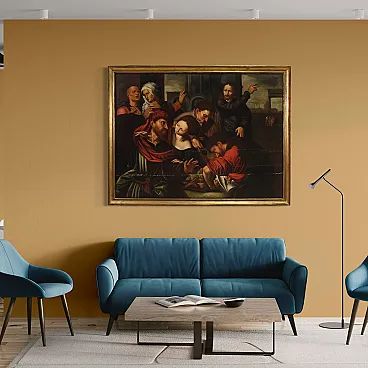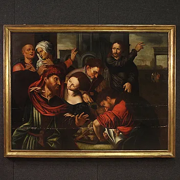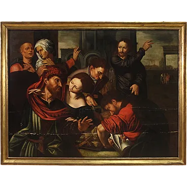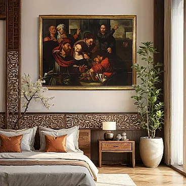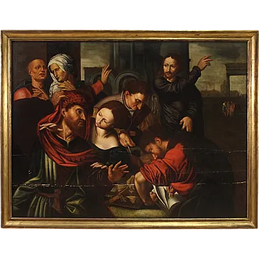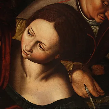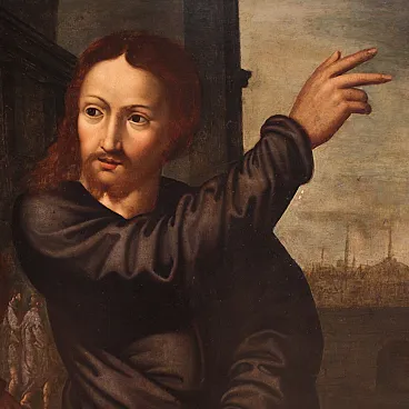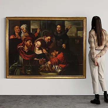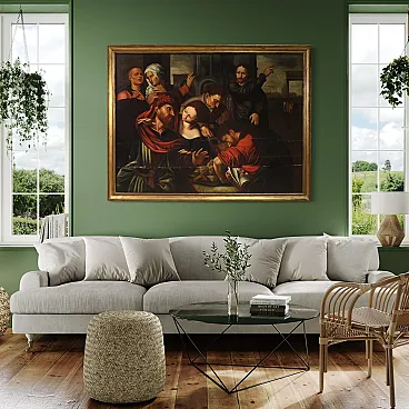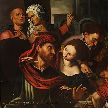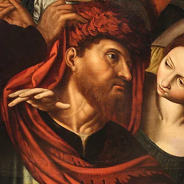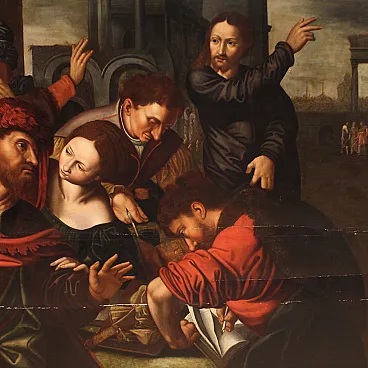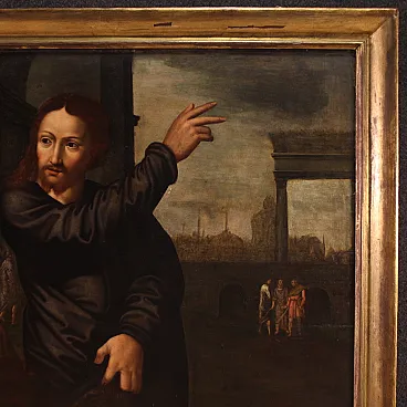 Grande dipinto fiammingo della seconda metà del XVI secolo. Opera ad olio su tavola raffigurante un episodio evangelico di grande fascino, la Vocazione di San Matteo. Quadro di straordinaria qualità pittorica e dai colori brillanti. La scena è ambientata in un interno ricco di minuziosi dettagli, con un forte senso della prospettiva e un uso teatrale della luce. Le figure sono solide e scolpite, con pose dinamiche e gesti espressivi. Il protagonista della composizione è Matteo, raffigurato come esattore delle tasse, mentre si volge verso Gesù che lo invita a seguirlo. Alcuni personaggi restano a capo chino, distratti dalle proprie occupazioni, mentre sullo sfondo scorgiamo in lontananza le splendide architetture di Gerusalemme. Dipinto attribuibile alla bottega di Jan Sanders Van Hemessen (1504-1567), mancante di autentica. Allievo di Hendrick van Cleve lavorò prevalentemente ad Anversa e divenne un membro di prestigio della Gilda di San Luca, la corporazione di artisti più importante delle Fiandre. Cornice del XX secolo in legno scolpito e dorato, con alcuni segni del tempo. Opera già restaurata con nuova parchettatura sul retro. Presenta alcune cadute di colore (vedi foto), nel complesso in buono stato conservativo. Luce dipinto H 124 x L 166 cm.