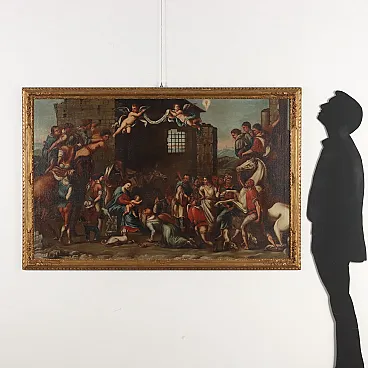 Tutto intorno, sono raffigurate molteplici figure del seguito dei re, insieme a gruppi di pastori che si arrampicano sulle rovine per assistere alla scena.