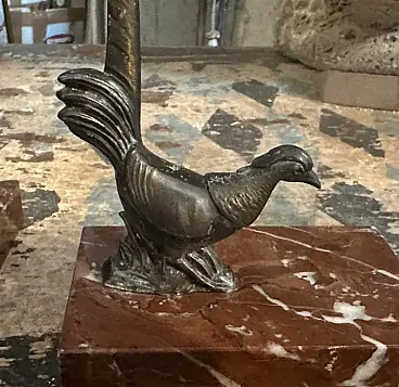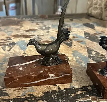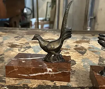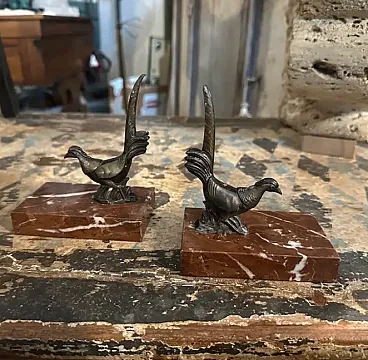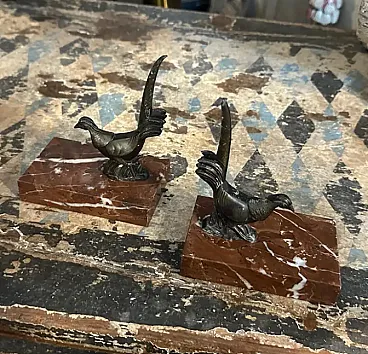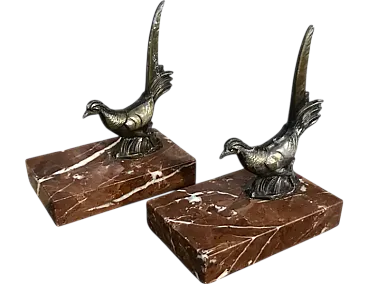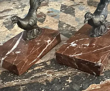 Si tratta di una coppia di fermalibri francesi Art Déco degli anni '30. Ogni fermalibri presenta un uccello scultoreo realizzato in metallo, che emana un'estetica elegante e snella tipica del periodo Art Déco. Gli uccelli sono montati su sostanziose basi di marmo, con una tonalità rosso-marrone e venature bianche che aggiungono un tocco di lusso e raffinatezza. La combinazione tra il marmo liscio e riflettente e i dettagliati uccelli metallici cattura l'essenza dell'artigianato Artistics francese, fondendo la semplicità geometrica con raffinati dettagli artistici. Perfetti per un uso sia decorativo che funzionale, questi fermalibri riflettono lo stile senza tempo dell'inizio del XX secolo. Sono in condizioni originali con piccoli segni d'uso e d'età visibili nelle foto.