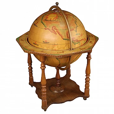 Grande mobile bar italiano degli anni 60 / 70. Porta alcolici costruito a forma di mappamondo in legno e metallo con carta applicata. Mobile sostenuto da quattro solide gambe poggianti su rotelle, ideale da inserire in un salotto o studio di bella decorazione e buona capacità. Presenta alcuni piccoli segni di usura, nel complesso in buono stato conservativo.