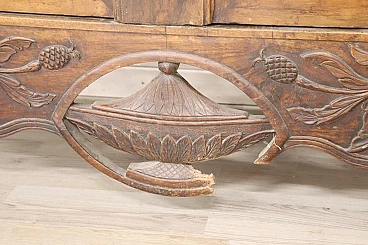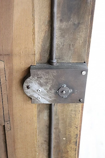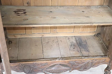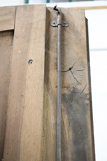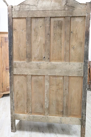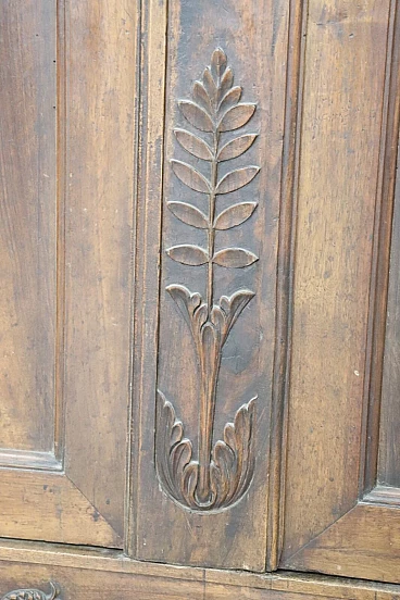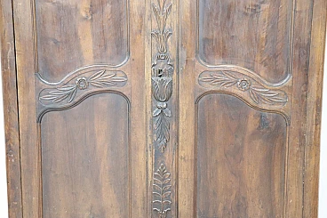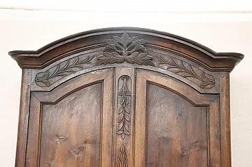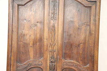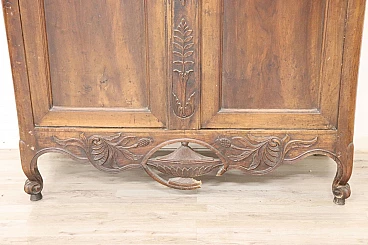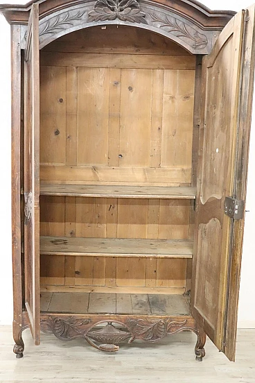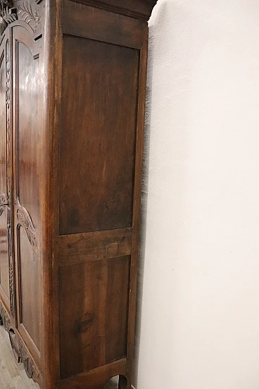 Imponente armadio antico alta epoca Luigi XV seconda metà del secolo XVIII di chiaro gusto ebanisteria francese. L'armadio è stato realizzato in pregiato legno di noce massello di gran patina. Le ante e i fianchi sono pannellati con riquadro. Sul fronte raffinata lavorazione ad intaglio del legno di gusto floreale culminante nella cimasa. Grande spazio utile interno presenti due ripiani manca bastone. Tutte le parti interne sono originali presenti chiodi dell'epoca ferramenta parzialmente sostituita. Usato necessita di restauro a livello di finitura e piccola rottura nella decorazione centrale in basso. L'armadio presenta una costruzione a spine di legno, in caso di spedizione verrà spedito smontato.