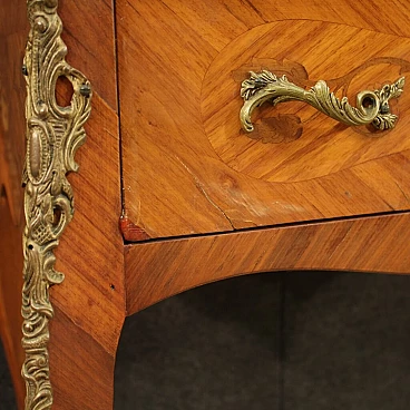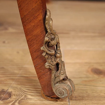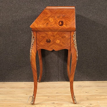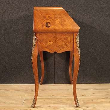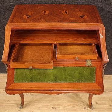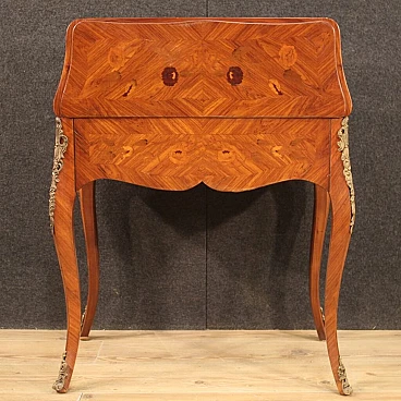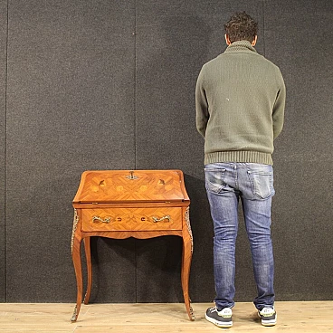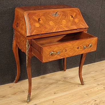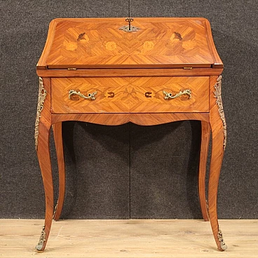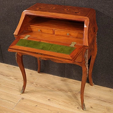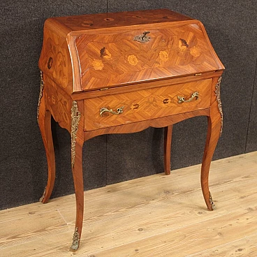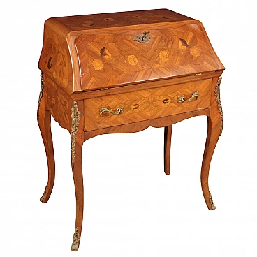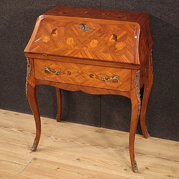 Ribaltina francese a gamba alta del XX secolo. Mobile finito da centro impiallacciato in legni di noce, bois de rose, mogano e legni frutto adornato da intarsio floreale. Ribalta munita di un cassetto esterno più calatoia di discreto servizio. Interno completo di due cassettini e piano scrittoio di misura contenuta (vedi foto). Mobile adornato da bronzo cesellato completo di una chiave funzionante. Ribaltina facilmente inseribile in diversi punti della casa, di ottima proporzione. Presenta qualche piccolo segno del tempo, nel complesso in buono stato conservativo.