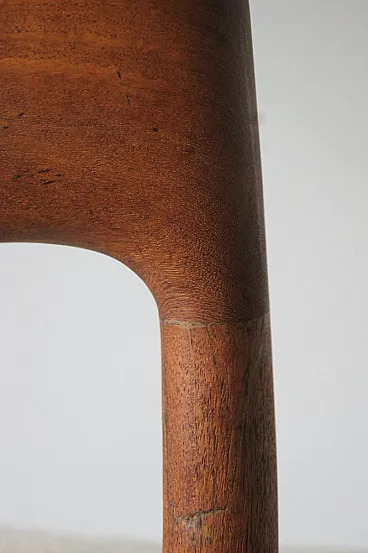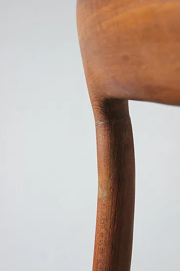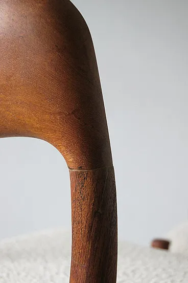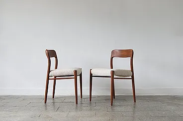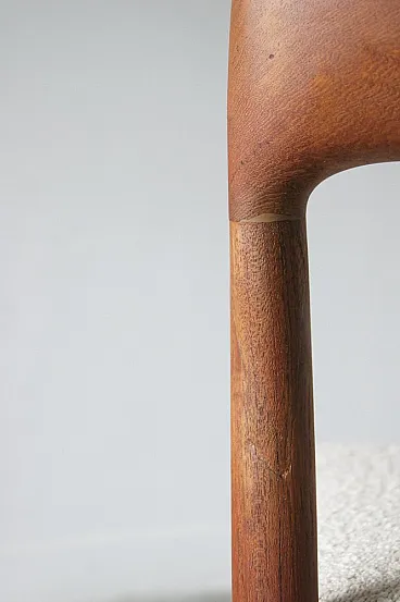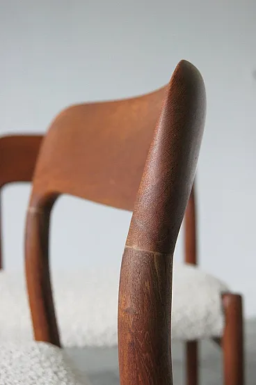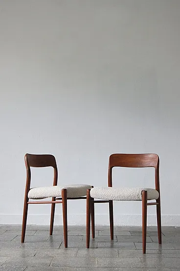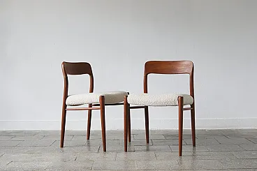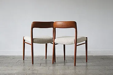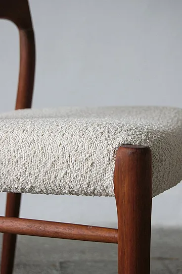 Sedie da pranzo danesi senza tempo in stile Mid Century, disegnate da Niels Otto Møller. Questi pezzi, splendidamente intagliati e confortevoli, sono caratterizzati dal tipico design organico danese, da una solida struttura in teak e da un'imbottitura in bouclé. La sedia è estremamente confortevole, una combinazione di forma eccellente e funzionalità attenta. Le sedie sono opera del designer danese, che si è rapidamente guadagnato una reputazione per l'eccellente qualità e lavorazione. L'impegno di Møller nei confronti del suo mestiere deriva dall'apprendistato in falegnameria, completato nel 1939, seguito da ulteriori studi presso la Scuola di Design di Århus. La coppia è stata trattata con olio di alta qualità, che ha conferito una finitura bella e naturale. Il set è nuovamente rivestito con un tessuto spesso di alta qualità. Le sedie sono state precedentemente riparate con lo schienale.
